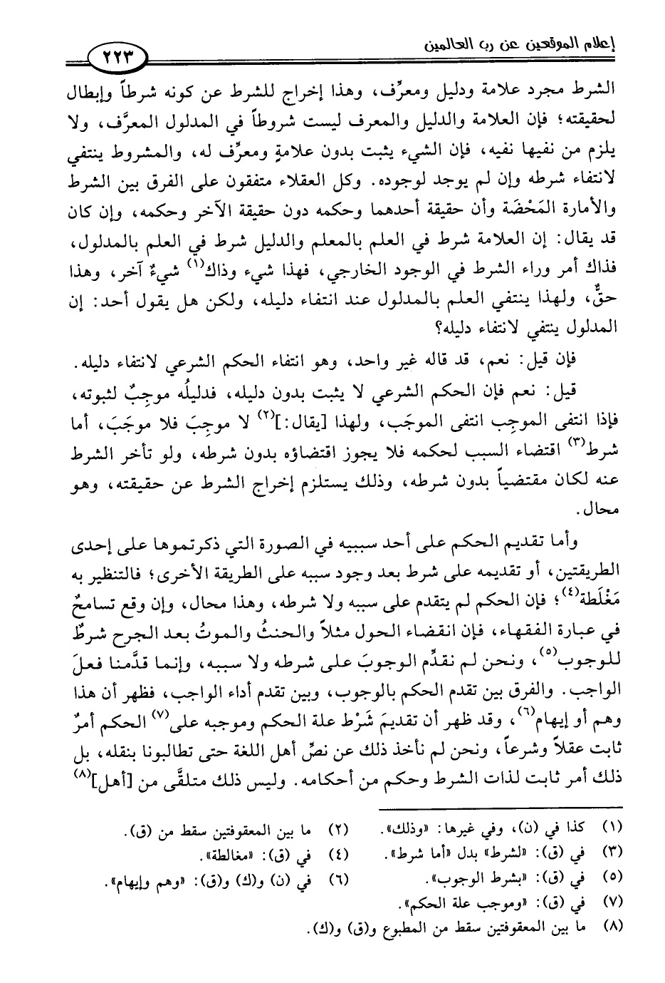 الشرط مجرد علامة ودليل ومعرِّف، وهذا إخراج للشرط عن كونه شرطًا وإبطال لحقيقته؛ فإن العلامة والدليل والمعرف ليست شروطًا في المدلول المعرَّف، ولا يلزم من نفيها نفيه، فإن الشيء يثبت بدون علامةٍ ومعرِّف له، والمشروط ينتفي لانتفاء شرطه وإن لم يوجد لوجوده. وكل العقلاء متفقون على الفرق بين الشرط والأمارة المَحْضَة وأن حقيقة أحدهما وحكمه دون حقيقة الآخر وحكمه، وإن كان قد يقال: إن العلامة شرط في العلم بالمعلم والدليل شرط في العلم بالمدلول، فذاك أمر وراء الشرط في الوجود الخارجي، فهذا شيء وذاك (١) شيءٌ آخر، وهذا حقٌّ، ولهذا ينتفي العلم بالمدلول عند انتفاء دليله، ولكن هل يقول أحد: إن المدلول ينتفي لانتفاء دليله؟