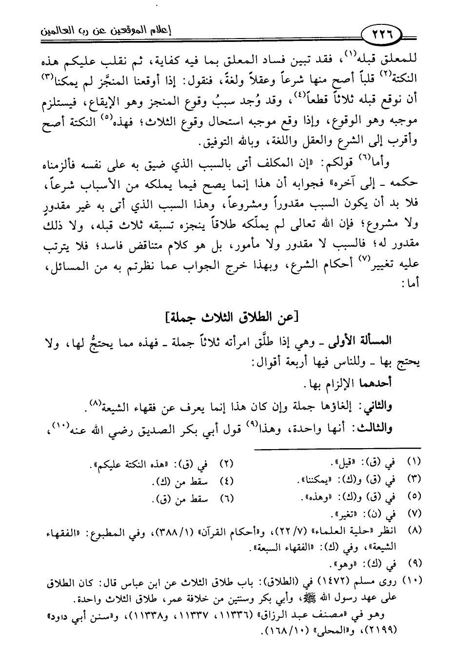 للمعلق قبله (١)، فقد تبين فساد المعلق بما فيه كفاية، ثم نقلب عليكم هذه النكتة (٢) قلبًا أصح منها شرعًا وعقلًا ولغةً، فنقول: إذا أوقعنا المنجَّز لم يمكنا (٣) أن نوقع قبله ثلاثًا قطعًا (٤)، وقد وُجد سببُ وقوع المنجز وهو الإيقاع، فيستلزم موجبه وهو الوقوع، وإذا وقع موجبه استحال وقوع الثلاث؛ فهذه (٥) النكتة أصح وأقرب إلى الشرع والعقل واللغة، وباللَّه التوفيق.
