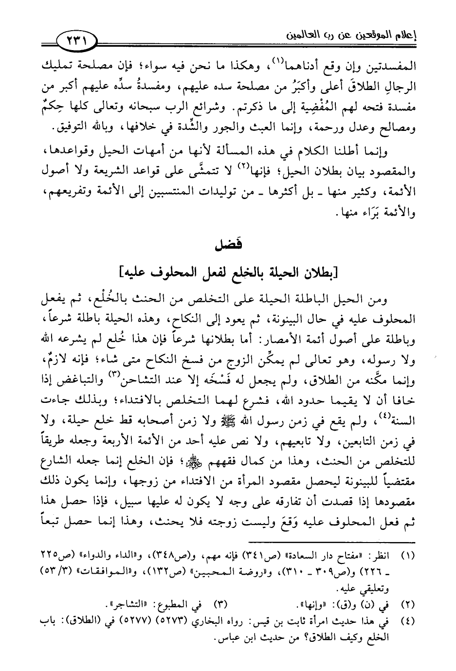 ومن الحيل الباطلة الحيلة على التخلص من الحنث بالخُلْع، ثم يفعل المحلوف عليه في حال البينونة، ثم يعود إلى النكاح، وهذه الحيلة باطلة شرعًا، وباطلة على أصول أئمة الأمصار: أما بطلانها شرعًا فإن هذا خُلع لم يشرعه اللَّه ولا رسوله، وهو تعالى لم يمكِّن الزوج من فسخ النكاح متى شاء؛ فإنه لازمٌ، وإنما مكَّنه من الطلاق، ولم يجعل له فَسْخَه إلا عند التشاحن (٣) والتباغض إذا خافا أن لا يقيما حدود اللَّه، فشرع لهما التخلص بالافتداء؛ وبذلك جاءت السنة (٤)، ولم يقع في زمن رسول اللَّه -صلى اللَّه عليه وسلم- ولا زمن أصحابه قط خلع حيلة، ولا في زمن التابعين، ولا تابعيهم، ولا نص عليه أحد من الأئمة الأربعة وجعله طريقًا للتخلص من الحنث، وهذا من كمال فقههم -رضي اللَّه عنهم-؛ فإن الخلع إنما جعله الشارع مقتضيًا للبينونة ليحصل مقصود المرأة من الافتداء من زوجها، وإنما يكون ذلك مقصودها إذا قصدت أن تفارقه على وجه لا يكون له عليها سبيل، فإذا حصل هذا ثم فعل المحلوف عليه وَقعَ وليست زوجته فلا يحنث، وهذا إنما حصل تبعًا