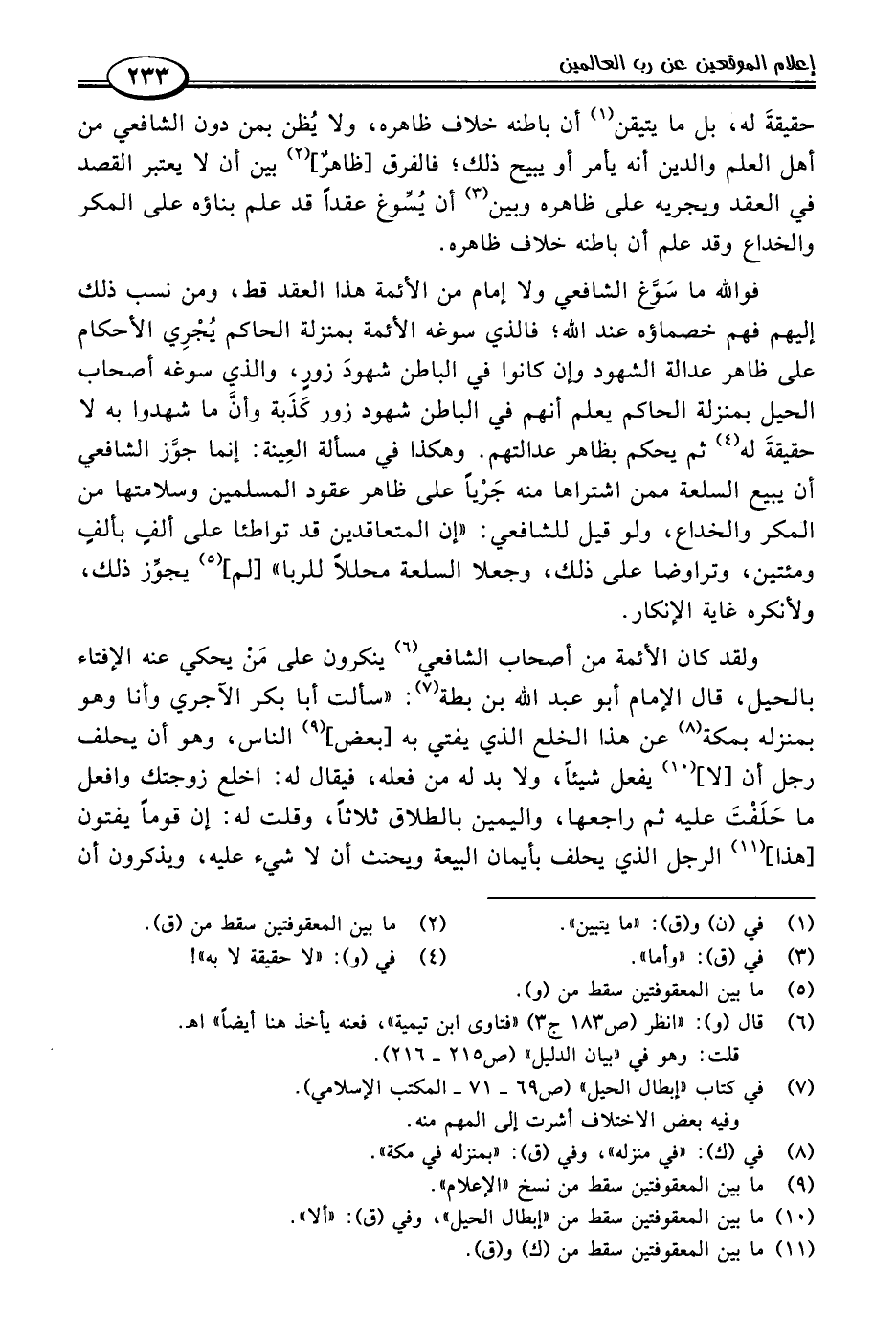 ولقد كان الأئمة من أصحاب الشافعي (٦) ينكرون على مَنْ يحكي عنه الإفتاء بالحيل، قال الإمام أبو عبد اللَّه بن بطة (٧): "سألت أبا بكر الآجري وأنا وهو بمنزله بمكة (٨) عن هذا الخلع الذي يفتي به [بعض] (٩) الناس، وهو أن يحلف رجل أن [لا] (١٠) يفعل شيئًا، ولا بد له من فعله، فيقال له: اخلع زوجتك وافعل ما حَلَفْتَ عليه ثم راجعها، واليمين بالطلاق ثلاثًا، وقلت له: إن قومًا يفتون [هذا] (١١) الرجل الذي يحلف بأيمان البيعة ويحنث أن لا شيء عليه، ويذكرون أن