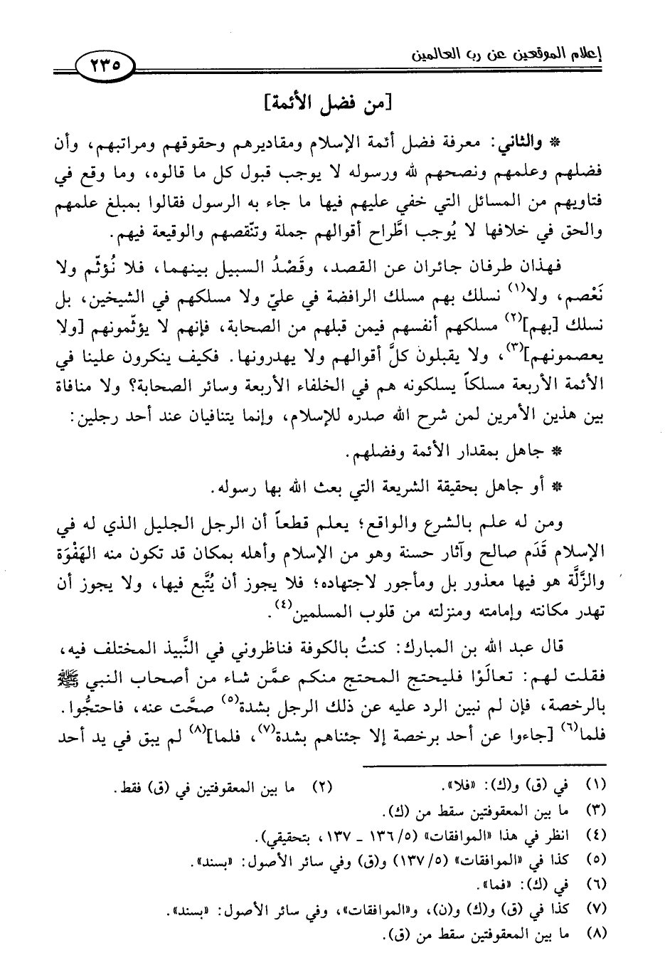 * والثاني: معرفة فضل أئمة الإسلام ومقاديرهم وحقوقهم ومراتبهم، وأن فضلهم وعلمهم ونصحهم للَّه ورسوله لا يوجب قبول كل ما قالوه، وما وقع في فتاويهم من المسائل التي خفي عليهم فيها ما جاء به الرسول فقالوا بمبلغ علمهم والحق في خلافها لا يُوجب اطَّراح أقوالهم جملة وتنّقصهم والوقيعة فيهم.