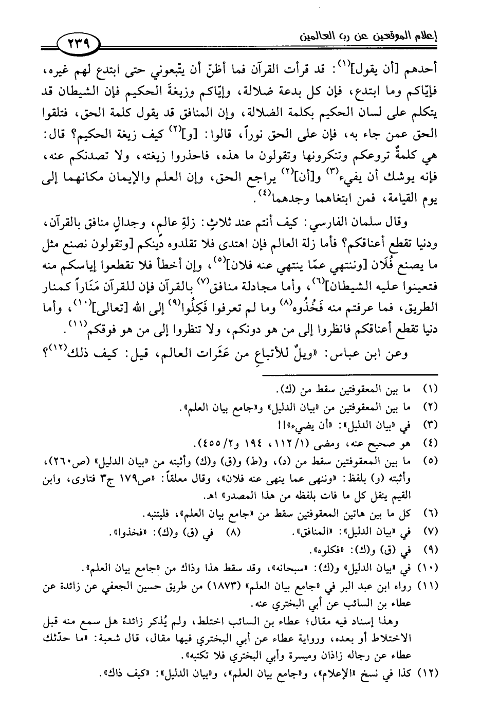 وقال سلمان الفارسي: كيف أنتم عند ثلاثٍ: زلةِ عالمٍ، وجدال منافق بالقرآن، ودنيا تقطع أعناقكم؟ فأما زلة العالم فإن اهتدى فلا تقلدوه دينكم [وتقولون نصنع مثل ما يصنع فُلَان [وننتهي عمّا ينتهي عنه فلان] (٥)، وإن أخطأ فلا تقطعوا إياسكم منه فتعينوا عليه الشيطان] (٦)، وأما مجادلة منافق (٧) بالقرآن فإن للقرآن مَنَارًا كمنار الطريق، فما عرفتم منه فَخُذُوه (٨) وما لم تعرفوا فَكِلُوا (٩) إلى اللَّه [تعالى] (١٠)، وأما دنيا تقطع أعناقكم فانظروا إلى من هو دونكم، ولا تنظروا إلى من هو فوقكم (١١).