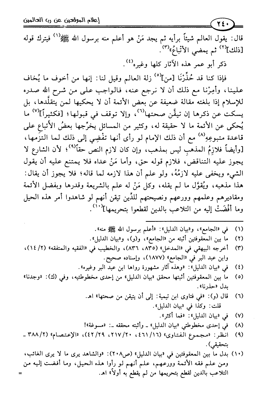 فإذا كنا قد حُذِّرْنَا [من] (٥) زلة العالم وقيل لنا: إنها من أخوف ما يُخاف علينا، وأمِرْنا مع ذلك أن لا نرجع عنه، فالواجب على من شرح اللَّه صدره للإسلام إذا بلغته مقالة ضعيفة عن بعض الأئمة أن لا يحكيها لمن يتقلَّدها، بل يسكت عن ذكرها إن تيقَّن صحتها (٦)، وإلا توقف في قبولها؛ [فكثيرًا] (٧) ما يُحكى عن الأئمة ما لا حقيقة له، وكثير من المسائل يخرِّجها بعضُ الأتباع على قاعدة متبوعِهِ (٨) مع أن ذلك الإمام لو رأى أنها تفْضِي إلى ذلك لما التزَمها، [وأيضًا فلازِمُ المذهبِ ليس بمذهب، وإن كان لازم النص حقًا (٩)؛ لأن الشارع لا يجوز عليه التناقض، فلازم قوله حق، وأما مَنْ عداه فلا يمتنع عليه أن يقول الشيء ويخفى عليه لازمُهُ، ولو علم أن هذا لازمه لما قاله؛ فلا يجوز أن يقال: هذا مذهبه، ويُقوَّل ما لم يقله، وكل مَنْ له علم بالشريعة وقدرها وبفضل الأئمة ومقاديرهم وعلمهم وورعهم ونصيحتهم للدِّين تيقن أنهم لو شاهدوا أمر هذه الحيل وما أفْضَتْ إليه من التلاعب بالدين لقطعوا بتحريمها] (١٠).