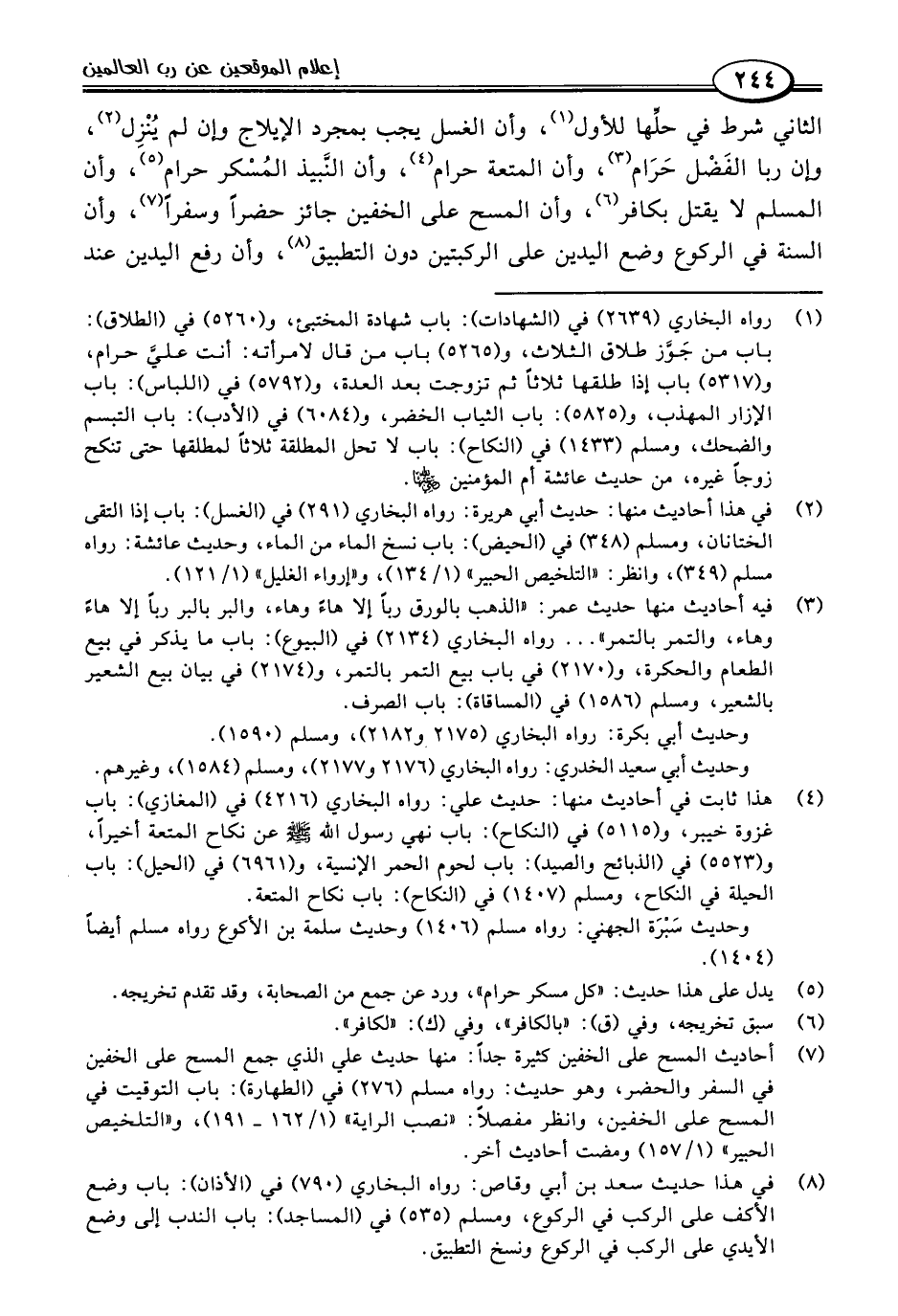 الثاني شرط في حلِّها للأول (١)، وأن الغسل يجب بمجرد الإيلاج وإن لم يُنْزِل (٢)، وإن ربا الفَضْل حَرَام (٣)، وأن المتعة حرام (٤)، وأن النَّبيذ المُسْكر حرام (٥)، وأن المسلم لا يقتل بكافر (٦)، وأن المسح على الخفين جائز حضرًا وسفرًا (٧)، وأن السنة في الركوع وضع اليدين على الركبتين دون التطبيق (٨)، وأن رفع اليدين عند