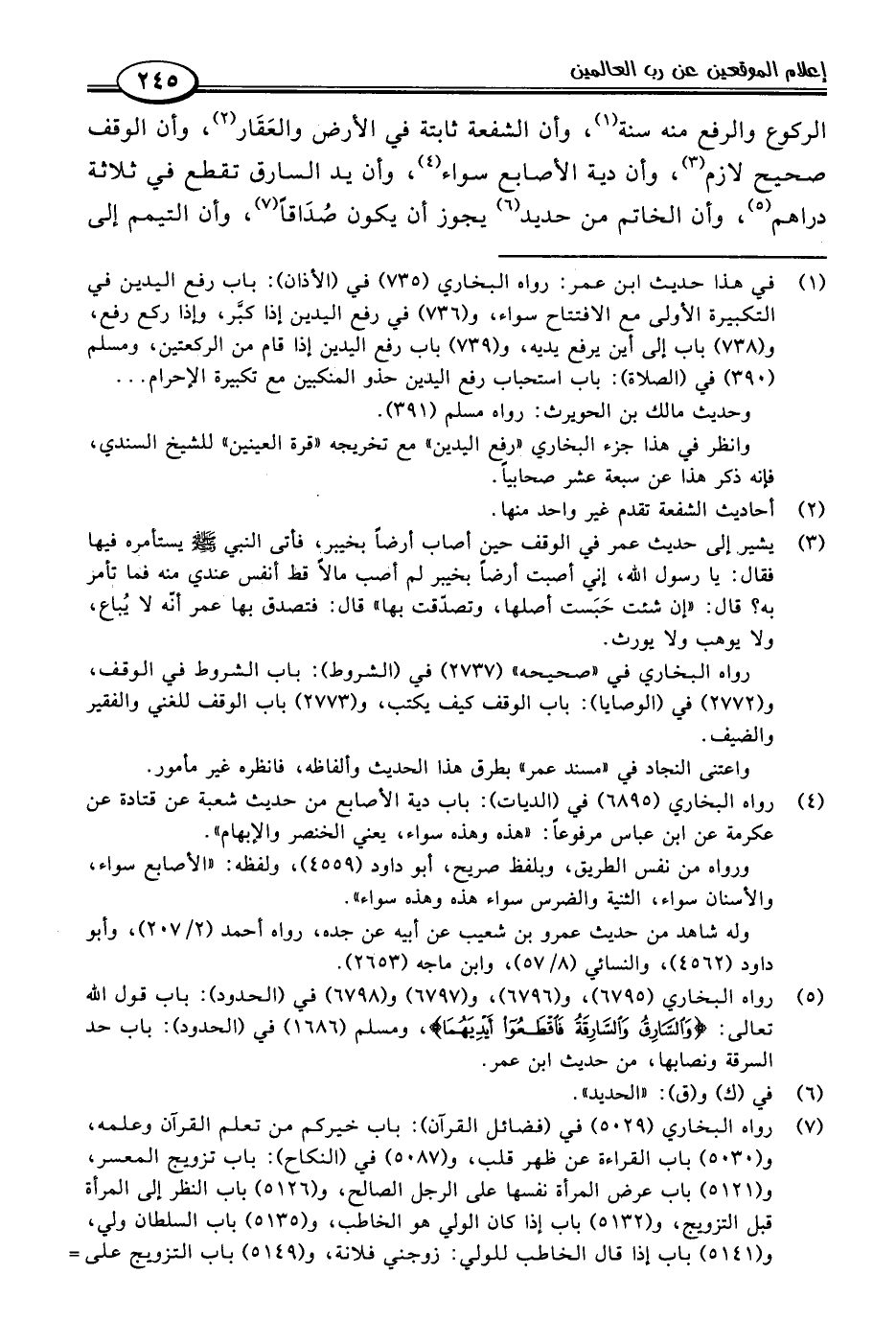 الركوع والرفع منه سنة (١)، وأن الشفعة ثابتة في الأرض والعَقَار (٢)، وأن الوقف صحيح لازم (٣)، وأن دية الأصابع سواء (٤)، وأن يد السارق تقطع في ثلاثة دراهم (٥)، وأن الخاتم من حديد (٦) يجوز أن يكون صُدَاقًا (٧)، وأن التيمم إلى
