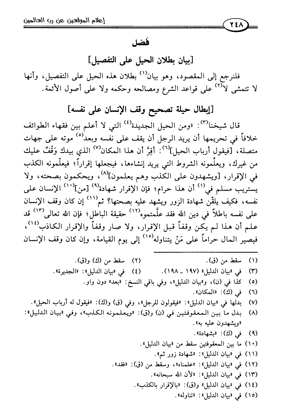 قال شيخنا (٣): "ومن الحيل الجديدة (٤) التي لا أعلم بين فقهاء الطوائف خلافًا في تحريمها أن يريد الرجل أن يقف على نفسه وبعد (٥) موته على جهات متصلة، [فيقول أرباب الحيل] (٦): أقِرَّ أن هذا المكان (٧) الذي بيدك وَقْفٌ عليك من غيرك، ويعلِّمونه الشروط التي يريد إنشاءها، فيجعلها إقرارًا؛ فيعلّمونه الكذب في الإقرار، [ويشهدون على الكذب وهم يعلمون] (٨)، ويحكمون بصحته، ولا يستريب مسلم في (١) أن هذا حرام؛ فإن الإقرار شهادة (٩) [من] (١٠) الإنسان على نفسه، فكيف يلقّن شهادة الزور ويشهد عليه بصحتها؟ ثم (١١) إن كان وقف الإنسان على نفسه باطلًا في دين اللَّه فقد علَّمتموه (١٢) حقيقة الباطل؛ فإن اللَّه تعالى (١٣) قد علم أن هذا لم يكن وقفًا قبل الإقرار، ولا صار وقفًا والإقرار الكاذب (١٤)، فيصير المال حرامًا على مَنْ يتناوله (١٥) إلى يوم القيامة، وإن كان وقف الإنسان
