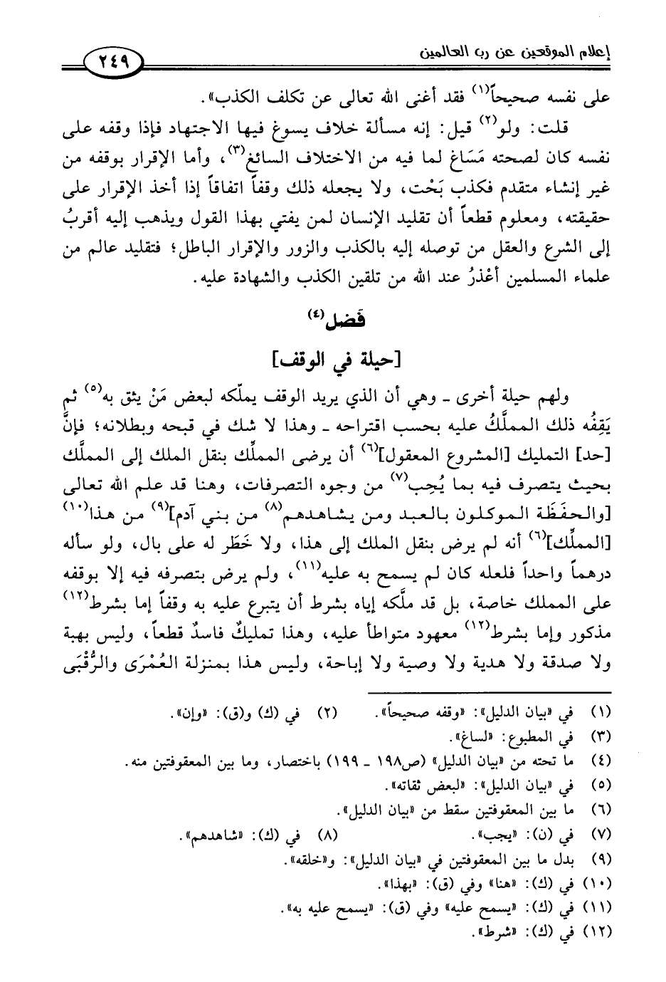 قلت: ولو (٢) قيل: إنه مسألة خلاف يسوغ فيها الاجتهاد فإذا وقفه على نفسه كان لصحته مَسَاغ لما فيه من الاختلاف السائغ (٣)، وأما الإقرار بوقفه من غير إنشاء متقدم فكذب بَحْت، ولا يجعله ذلك وقفًا اتفاقًا إذا أخذ الإقرار على حقيقته، ومعلوم قطعًا أن تقليد الإنسان لمن يفتي بهذا القول ويذهب إليه أقربُ إلى الشرع والعقل من توصله إليه بالكذب والزور والإقرار الباطل؛ فتقليد عالم من علماء المسلمين أعْذرُ عند اللَّه من تلقين الكذب والشهادة عليه.