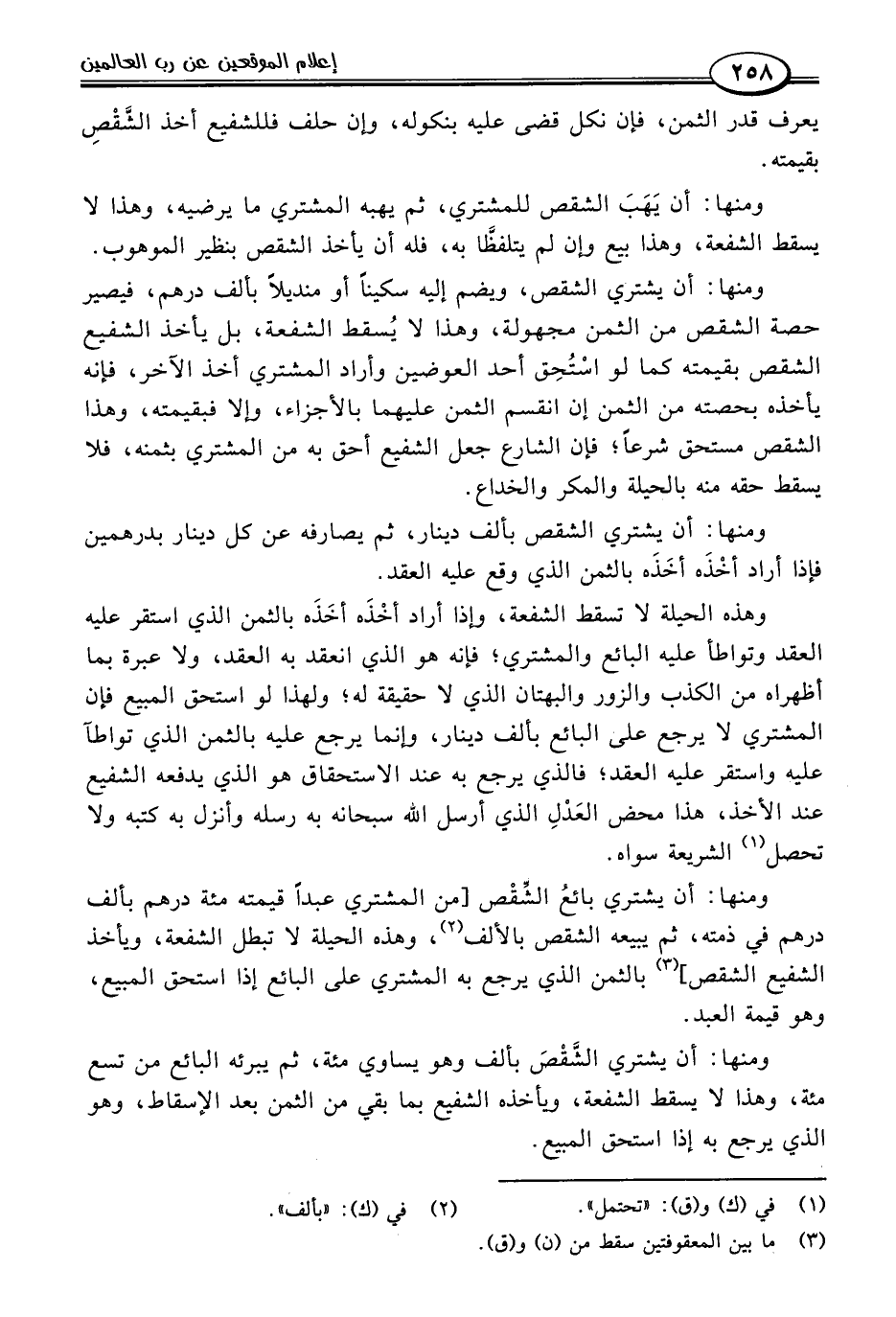 وهذه الحيلة لا تسقط الشفعة، وإذا أراد أخْذَه أخَذَه بالثمن الذي استقر عليه العقد وتواطأ عليه البائع والمشتري؛ فإنه هو الذي انعقد به العقد، ولا عبرة بما أظهراه من الكذب والزور والبهتان الذي لا حقيقة له؛ ولهذا لو استحق المبيع فإن المشتري لا يرجع على البائع بألف دينار، وإنما يرجع عليه بالثمن الذي تواطآ عليه واستقر عليه العقد؛ فالذي يرجع به عند الاستحقاق هو الذي يدفعه الشفيع عند الأخذ، هذا محض العَدْلِ الذي أرسل اللَّه سبحانه به رسله وأنزل به كتبه ولا تحصل (١) الشريعة سواه.