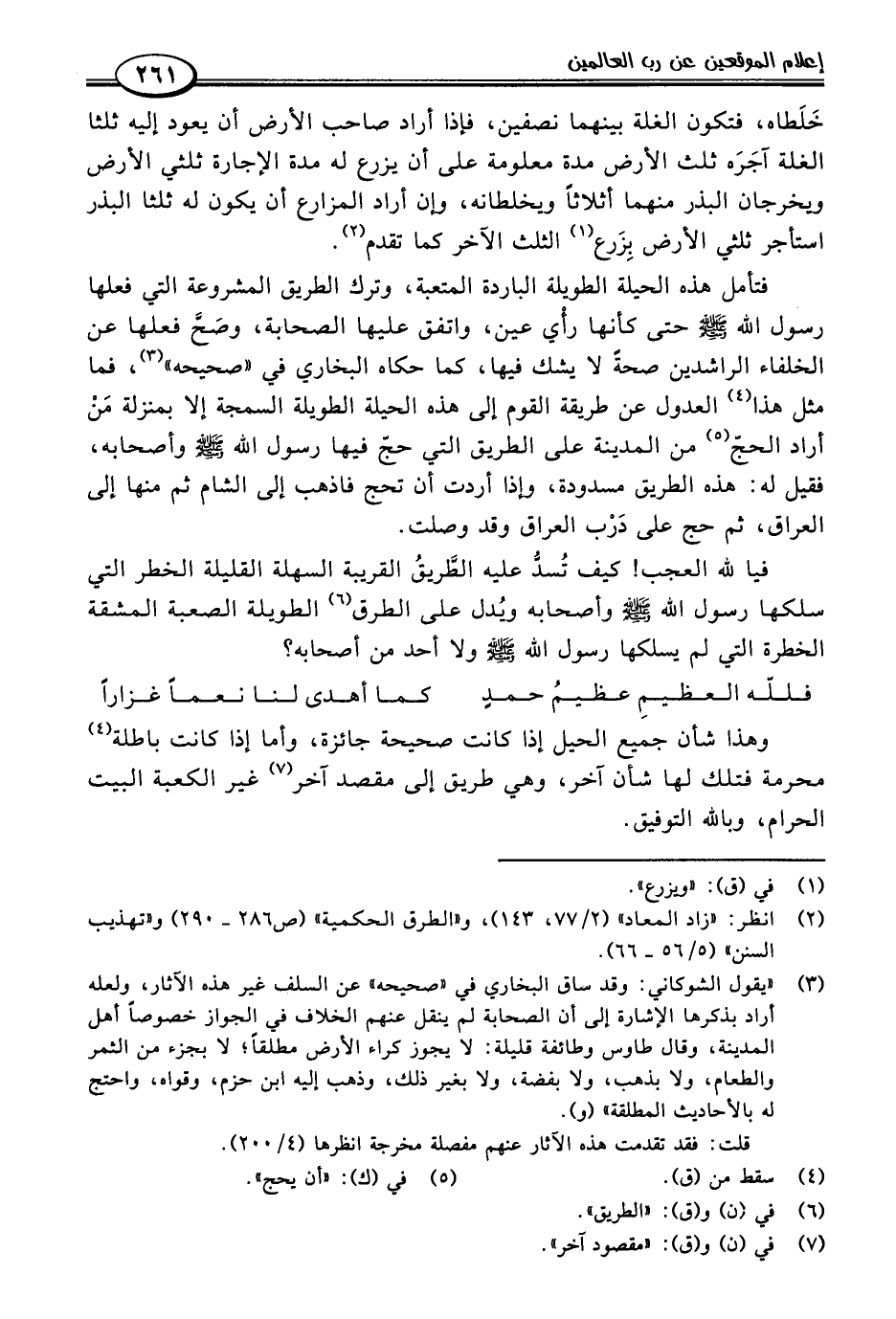 فتأمل هذه الحيلة الطويلة الباردة المتعبة، وترك الطريق المشروعة التي فعلها رسول اللَّه -صلى اللَّه عليه وسلم- حتى كأنها رأي عين، واتفق عليها الصحابة، وصَحَّ فعلها عن الخلفاء الراشدين صحةً لا يشك فيها، كما حكاه البخاري في "صحيحه" (٣)، فما مثل هذا (٤) العدول عن طريقة القوم إلى هذه الحيلة الطويلة السمجة إلا بمنزلة مَنْ أراد الحجّ (٥) من المدينة على الطريق التي حجّ فيها رسول اللَّه -صلى اللَّه عليه وسلم- وأصحابه، فقيل له: هذه الطريق مسدودة، وإذا أردت أن تحج فاذهب إلى الشام ثم منها إلى العراق، ثم حج على دَرْب العراق وقد وصلت.