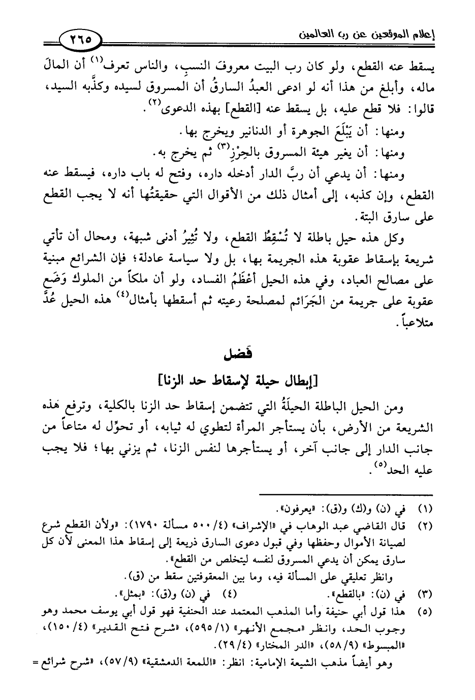 وكل هذه حيل باطلة لا تُسْقِطُ القطع، ولا تُثِيرُ أدنى شبهة، ومحال أن تأتي شريعة بإسقاط عقوبة هذه الجريمة بها، بل ولا سياسة عادلة؛ فإن الشرائع مبنية على مصالح العباد، وفي هذه الحيل أعْظَمُ الفساد، ولو أن ملكًا من الملوك وَضَع عقوبة على جريمة من الجَرَائم لمصلحة رعيته ثم أسقطها بأمثال (٤) هذه الحيل عُدَّ متلاعبًا.