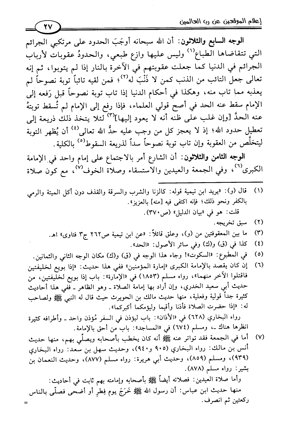 الوجه الثامن والثلاثون: أن الشارع أمر بالاجتماع على إمام واحد في الإمامة الكبرى (٦)، وفي الجمعة والعيدين والاستسقاء وصلاة الخوف (٧)، مع كون صلاة
