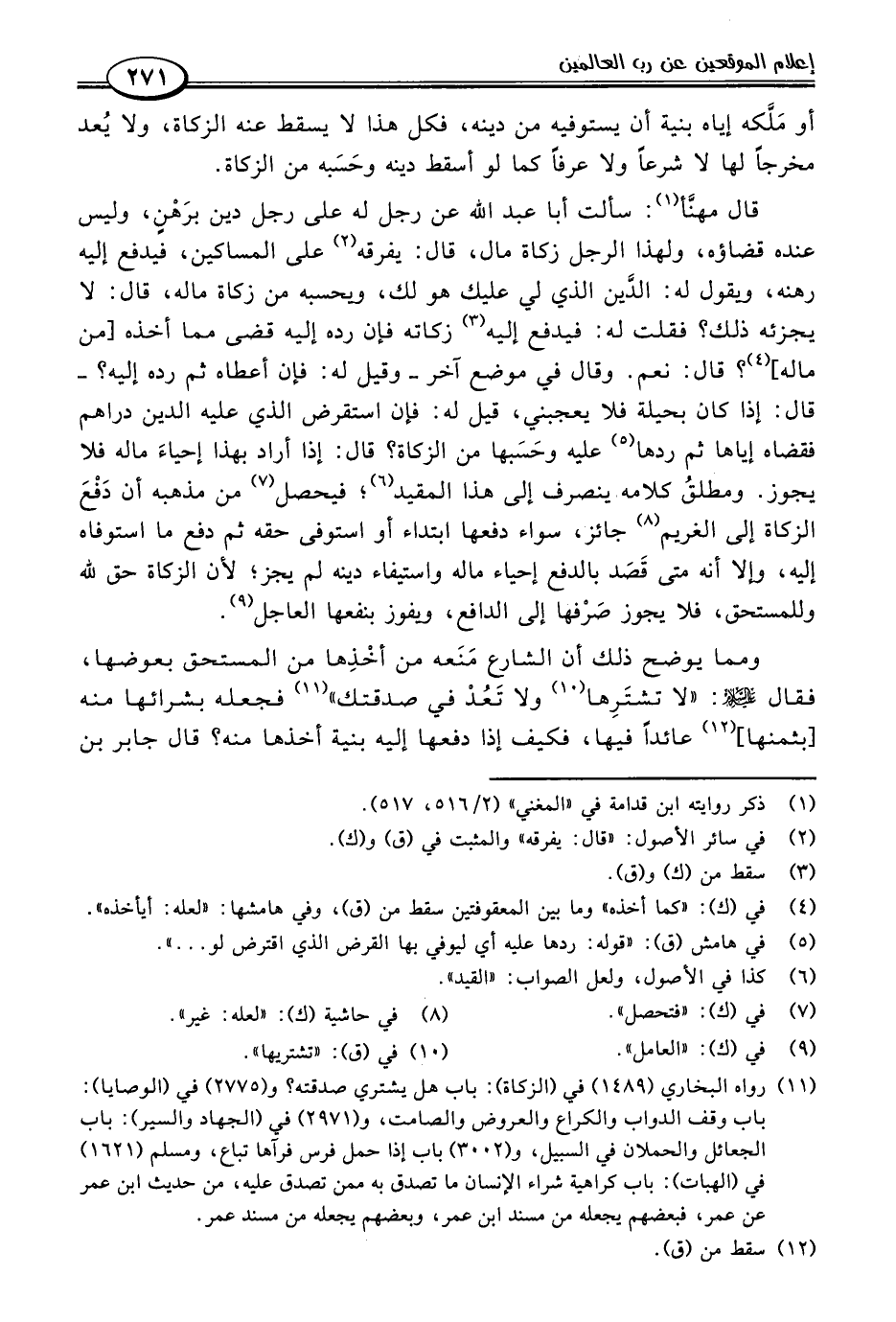 قال مهَّنأ (١): سألت أبا عبد اللَّه عن رجل له على رجل دين برَهْنٍ، وليس عنده قضاؤه، ولهذا الرجل زكاة مال، قال: يفرقه (٢) على المساكين، فيدفع إليه رهنه، ويقول له: الدَّين الذي لي عليك هو لك، ويحسبه من زكاة ماله، قال: لا يجزئه ذلك؟ فقلت له: فيدفع إليه (٣) زكاته فإن رده إليه قضى مما أخذه [من ماله] (٤)؟ قال: نعم. وقال في موضع آخر -وقيل له: فإن أعطاه ثم رده إليه؟ - قال: إذا كان بحيلة فلا يعجبني، قيل له: فإن استقرض الذي عليه الدين دراهم فقضاه إياها ثم ردها (٥) عليه وحَسَبها من الزكاة؟ قال: إذا أراد بهذا إحياءَ ماله فلا يجوز. ومطلقُ كلامه ينصرف إلى هذا المقيد (٦)؛ فيحصل (٧) من مذهبه أن دَفْعَ الزكاة إلى الغريم (٨) جائز، سواء دفعها ابتداء أو استوفى حقه ثم دفع ما استوفاه إليه، وإلا أنه متى قَصَد بالدفع إحياء ماله واستيفاء دينه لم يجز؛ لأن الزكاة حق للَّه وللمستحق، فلا يجوز صَرْفها إلى الدافع، ويفوز بنفعها العاجل (٩).