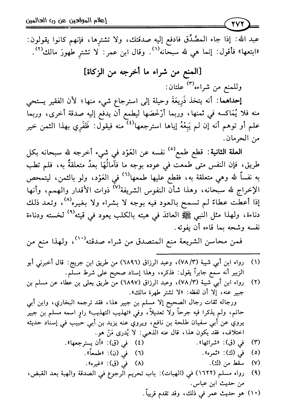 عبد اللَّه: إذا جاء المصَّدِّق فادفع إليه صدقتك، ولا تشترِها، فإنهم كانوا يقولون: "ابتعها" فأقول: إنما هي للَّه سبحانه (١). وقال ابن عمر: لا تشترِ طهورَ مالك (٢).