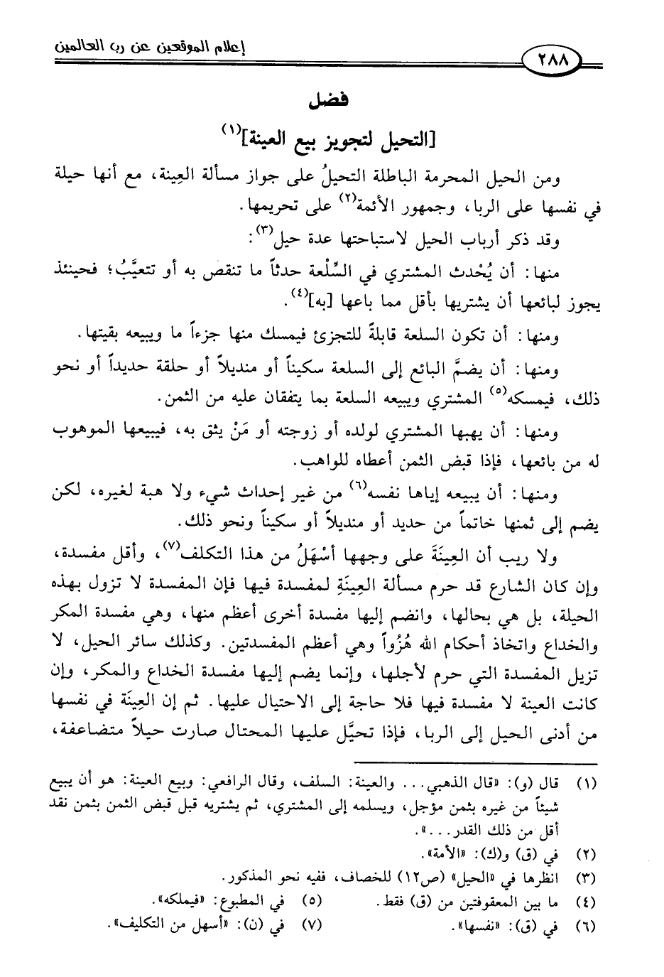 ولا ريب أن العِينَةَ على وجهها أسْهَلُ من هذا التكلف (٧)، وأقل مفسدة، وإن كان الشارع قد حرم مسألة العِينَةِ لمفسدة فيها فإن المفسدة لا تزول بهذه الحيلة، بل هي بحالها، وانضم إليها مفسدة أخرى أعظم منها، وهي مفسدة المكر والخداع واتخاذ أحكام اللَّه هُزُوًا وهي أعظم المفسدتين. وكذلك سائر الحيل، لا تزيل المفسدة التي حرم لأجلها، وإنما يضم إليها مفسدة الخداع والمكر، وإن كانت العينة لا مفسدة فيها فلا حاجة إلى الاحتيال عليها. ثم إن العِينَة في نفسها من أدنى الحيل إلى الربا، فإذا تحيل عليها المحتال صارت حيلًا متضاعفة،