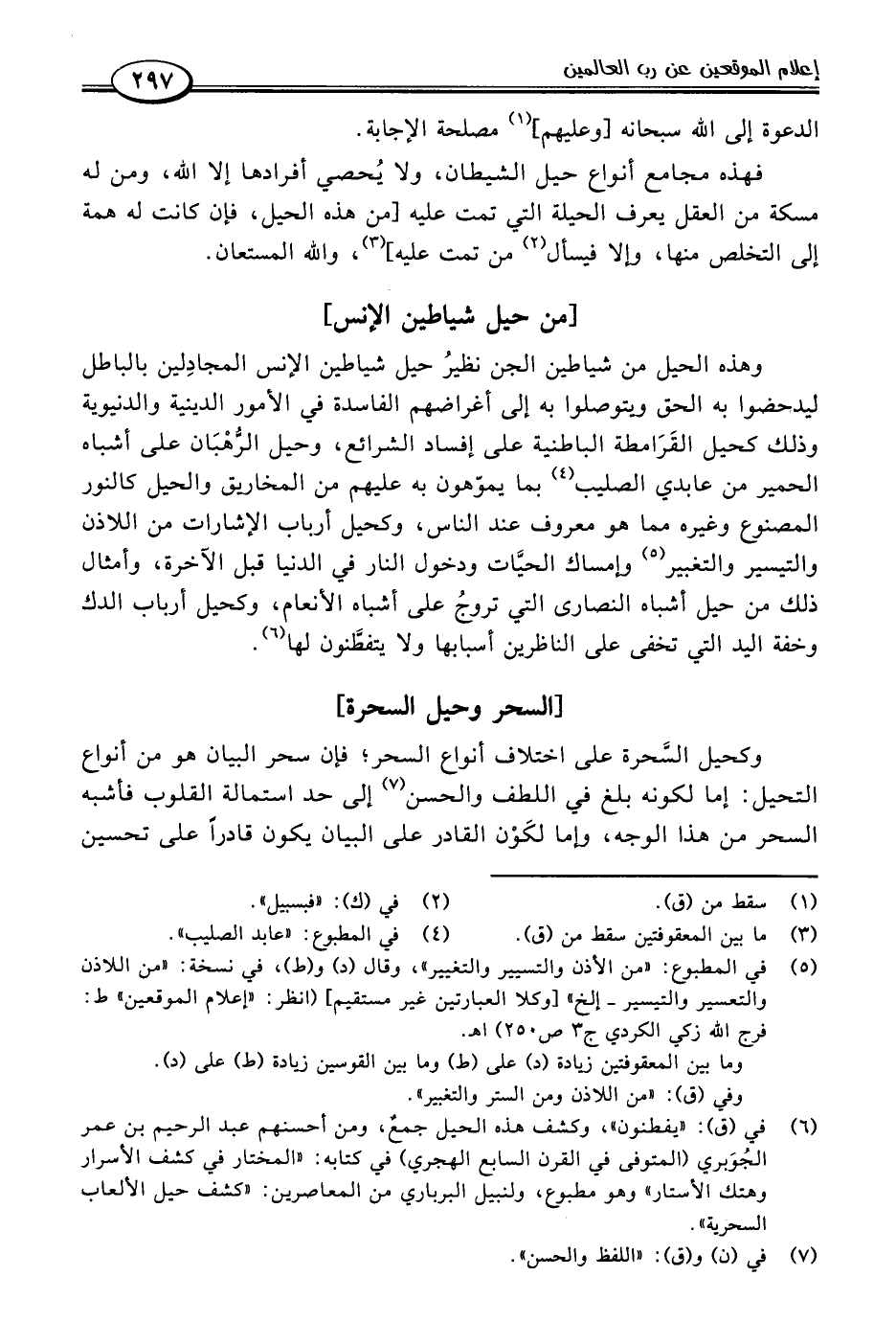 وهذه الحيل من شياطين الجن نظيرُ حيل شياطين الإنس المجادِلين بالباطل ليدحضوا به الحق ويتوصلوا به إلى أغراضهم الفاسدة في الأمور الدينية والدنيوية وذلك كحيل القَرَامطة الباطنية على إفساد الشرائع، وحيل الرُّهْبَان على أشباه الحمير من عابدي الصليب (٤) بما يموّهون به عليهم من المخاريق والحيل كالنور المصنوع وغيره مما هو معروف عند الناس، وكحيل أرباب الإشارات من اللاذن والتيسير والتغبير (٥) وإمساك الحيَّات ودخول النار في الدنيا قبل الآخرة، وأمثال ذلك من حيل أشباه النصارى التي تروجُ على أشباه الأنعام، وكحيل أرباب الدك وخفة اليد التي تخفى على الناظرين أسبابها ولا يتفطَّنون لها (٦).