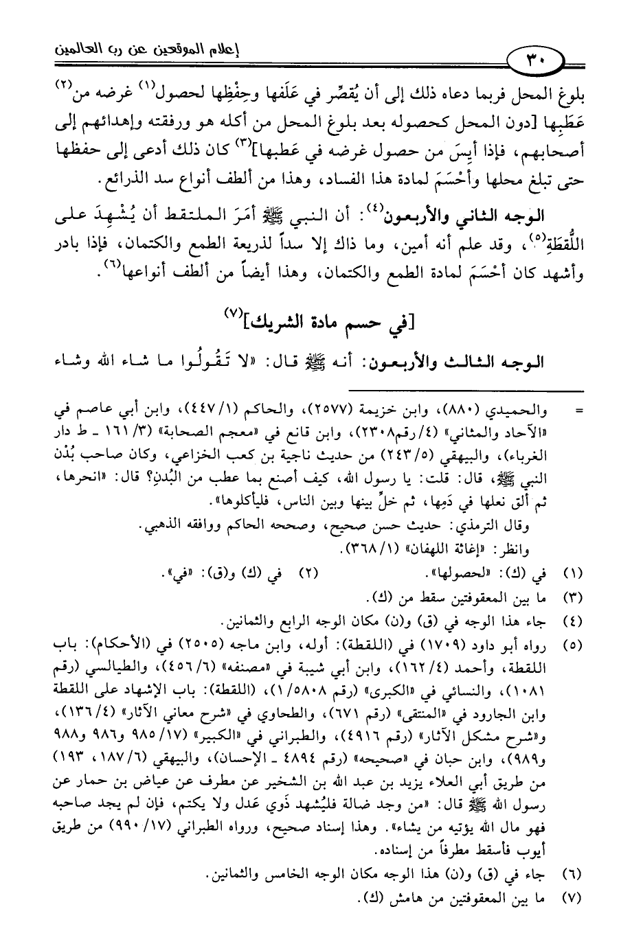 الوجه الثاني والأربعون (٤): أن النبي -صلى اللَّه عليه وسلم- أمَرَ الملتقط أن يُشْهِدَ على اللُّقطَةِ (٥)، وقد علم أنه أمين، وما ذاك إلا سدًا لذريعة الطمع والكتمان، فإذا بادر وأشهد كان أحْسَمَ لمادة الطمع والكتمان، وهذا أيضًا من ألطف أنواعها (٦).