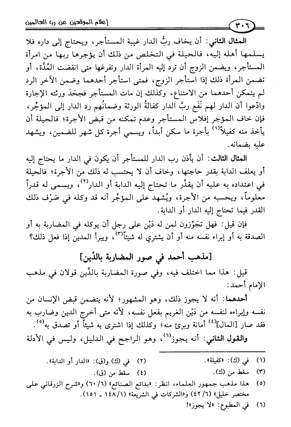 المثال الثاني: أن يخاف ربُّ الدار غيبة المستأجر، ويحتاج إلى داره فلا يسلمها أهله إليه، فالحيلة في التخلص من ذلك أن يؤجرها ربها من امرأة المستأجر، ويضمن الزوج أن ترد إليه المرأة الدار وتفرغها متى انقضت المُدَّة، أو تضمن المرأة ذلك إذا استاجر الزوج، فمتى استأجر أحدهما وضمن الآخر الرد لم يتمكن أحدهما من الامتناع، وكذلك إن مات المستاجر فجحَدَ ورثته الإجارة وادّعوا أن الدار لهم نَفَع ربَّ الدار كفالةُ الورثة وضمانُهم رد الدار إلى المؤجِّر، فإن خاف المؤجر إفلاس المستأجر وعدم تمكنه من قبض الأجرة؛ فالحيلة أن يأخذ منه كفيلًا (١) بأجرة ما سكن أبدًا، ويسمي أجرة كل شهر للضمين، ويشهد عليه بضمانه.