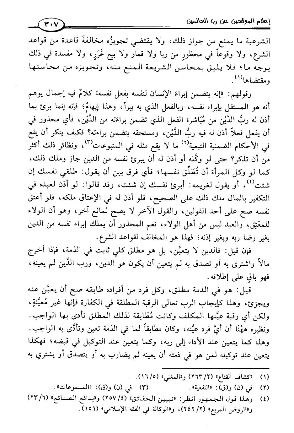 وقولهم: "إنه يتضمن إبراءَ الإنسان لنفسه بفعل نفسه" كلامٌ فيه إجمال يوهم أنه هو المستقل بإبراء نفسه، وبالفعل الذي به يبرأ، وهذا إيهامٌ؛ فإنه إنما برئ بما أذن له ربُّ الدَّيْن من مُبَاشرة الفعل الذي تضمن براءَته من الدَّيْن، فأي محذور في أن يفعل فعلًا أذن له فيه ربُّ الدَّيْن، ومستحقه يتضمن براءته؟ فكيف ينكر أن يقع في الأحكام الضمنية التبعية (٢) ما لا يقع مثله في المتبوعات (٣)، ونظائر ذلك أكثر من أن تذكر؟ حتى لو وكَّله أو أذن له أن يبرئ نفسه من الدين جاز وملك ذلك، كما لو وكل المرأة أن تُطَلِّق نفسها؛ فأي فرق بين أن يقول: طلقي نفسك إن شئت (٤)، أو يقول لغريمه: أبرئ نفسك إن شئت، وقد قالوا: لو أذن لعبده في التكفير بالمال ملك ذلك على الصحيح، فلو أذن له في الإعتاق ملكه، فلو أعتق نفسه صح على أحد القولين، والقول الآخر لا يصح لمانع آخر، وهو أن الولاء للمعْتِق، والعبد ليس من أهل الولاء، نعم المحذور أن يملك إبراء نفسه من الدين بغير رضا ربه وبغير إذنه؛ فهذا هو المخالف لقواعد الشرع.