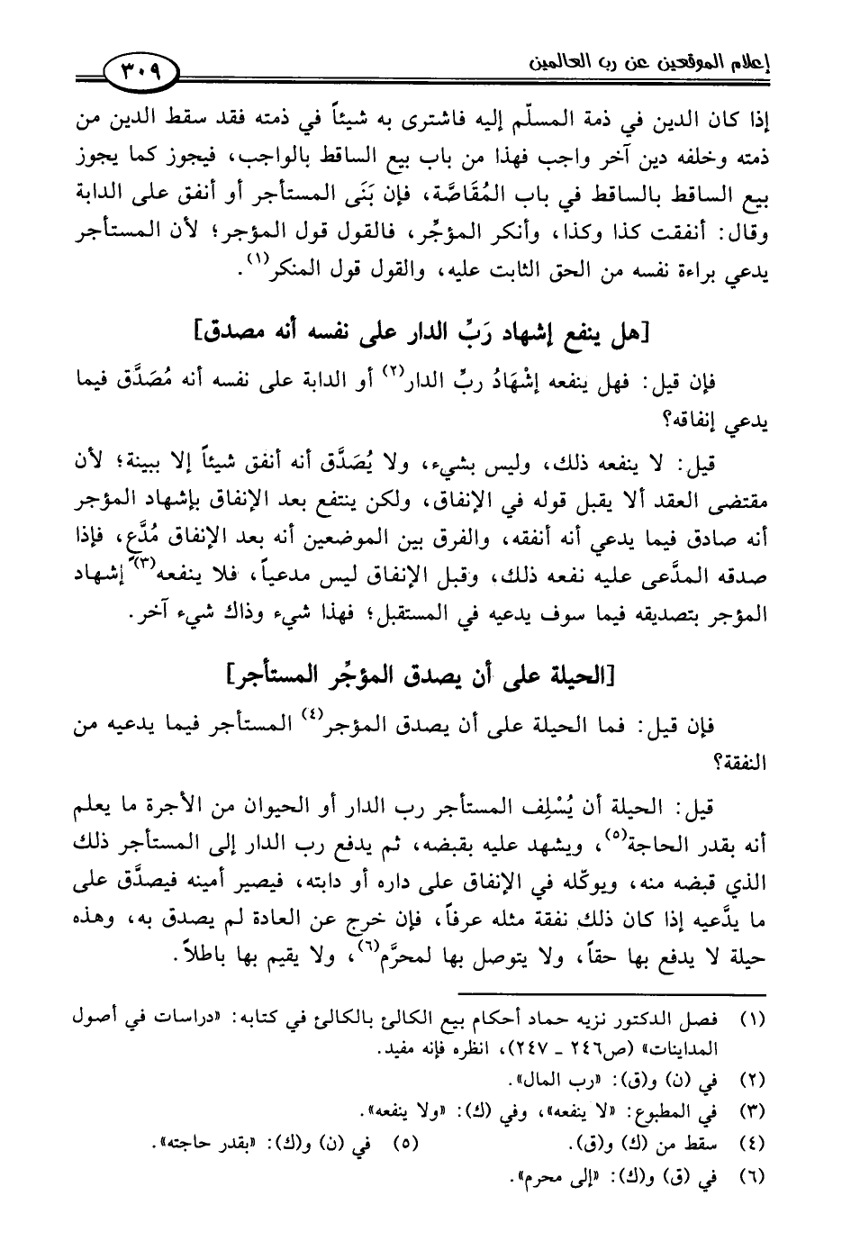 قيل: الحيلة أن يُسْلِف المستأجر رب الدار أو الحيوان من الأجرة ما يعلم أنه بقدر الحاجة (٥)، ويشهد عليه بقبضه، ثم يدفع رب الدار إلى المستأجر ذلك الذي قبضه منه، ويوكّله في الإنفاق على داره أو دابته، فيصير أمينه فيصدَّق على ما يدَّعيه إذا كان ذلك نفقة مثله عرفًا، فإن خرج عن العادة لم يصدق به، وهذه حيلة لا يدفع بها حقًا، ولا يتوصل بها لمحرَّم (٦)، ولا يقيم بها باطلًا.