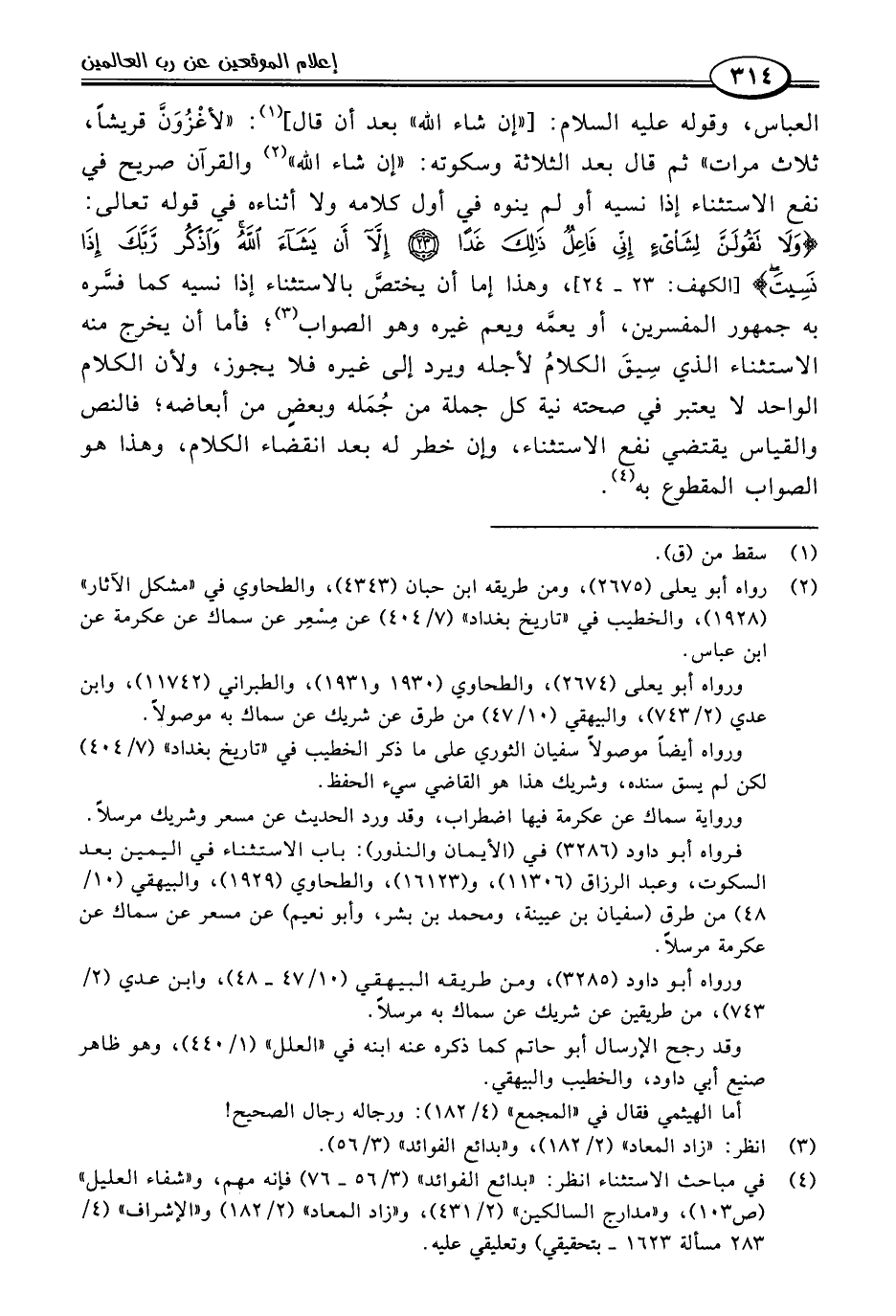 (٤) في مباحث الاستثناء انظر: "بدائع الفوائد" (٣/ ٥٦ - ٧٦) فإنه مهم، و"شفاء العليل" (ص ١٠٣)، و"مدارج السالكين" (٢/ ٤٣١)، و"زاد المعاد" (٢/ ١٨٢) و"الإشراف" (٤/ ٢٨٣ مسألة ١٦٢٣ - بتحقيقي) وتعليقي عليه.
