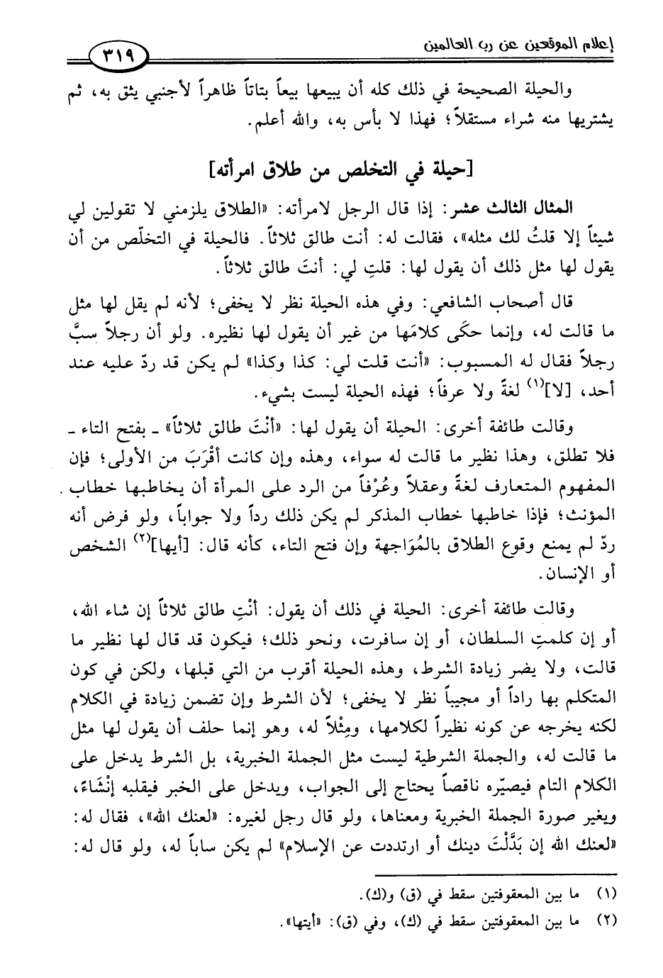 المثال الثالث عشر: إذا قال الرجل لامرأته: "الطلاق يلزمني لا تقولين لي شيئًا إلا قلتُ لك مثله"، فقالت له: أنت طالق ثلاثًا. فالحيلة في التخلّص من أن يقول لها مثل ذلك أن يقول لها: قلتِ لي: أنتَ طالق ثلاثًا.