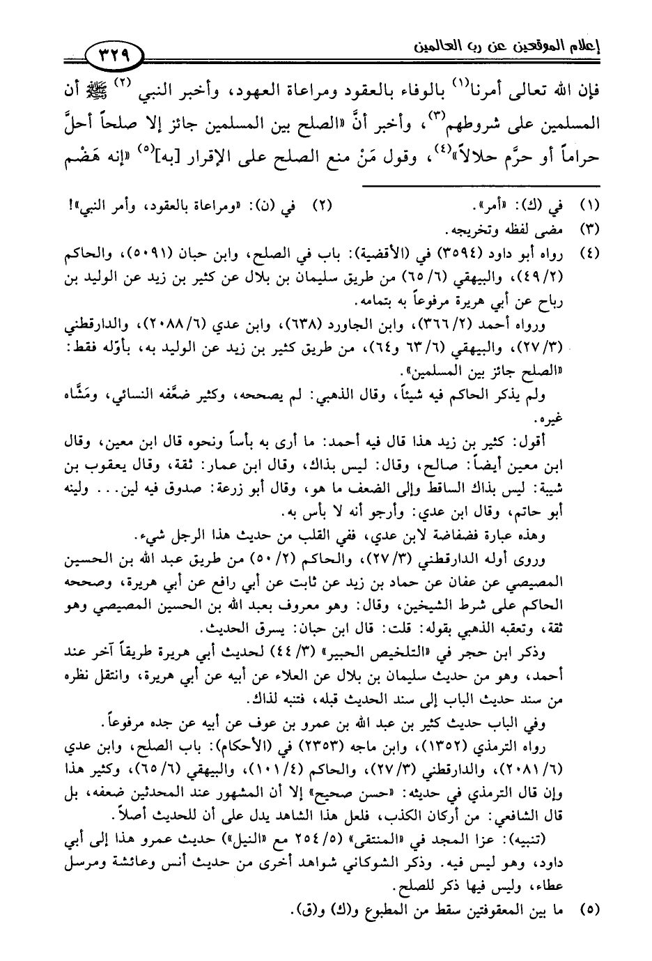 (٤) رواه أبو داود (٣٥٩٤) في (الأقضية): باب في الصلح، وابن حبان (٥٠٩١)، والحاكم (٢/ ٤٩)، والبيهقي (٦/ ٦٥) من طريق سليمان بن بلال عن كثير بن زيد عن الوليد بن رباح عن أبي هريرة مرفوعًا به بتمامه.
