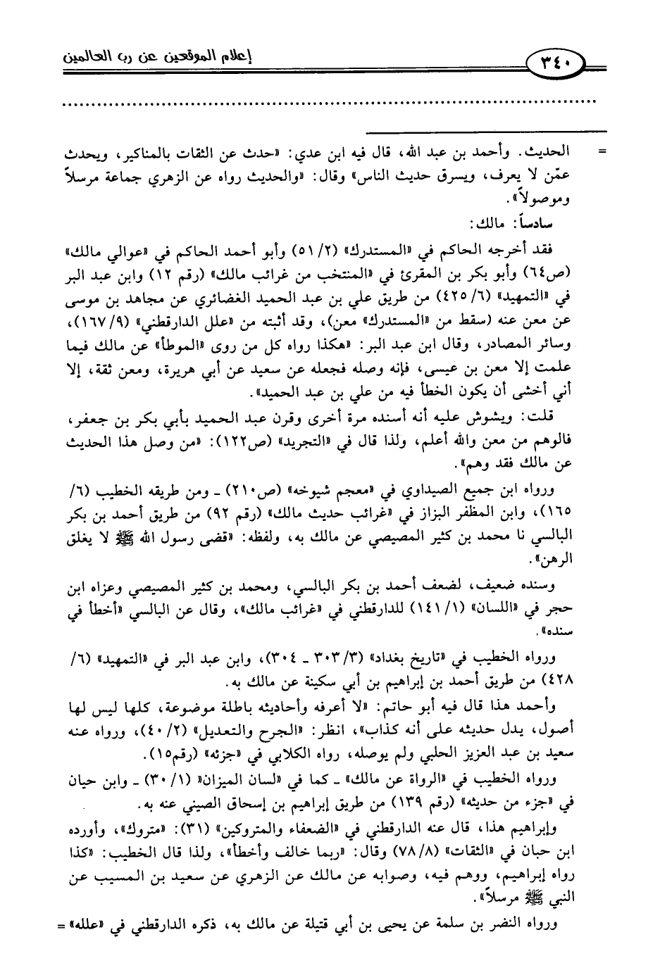 ورواه الخطيب في "تاريخ بغداد" (٣/ ٣٠٣ - ٣٠٤)، وابن عبد البر في "التمهيد" (٦/ ٤٢٨) من طريق أحمد بن إبراهيم بن أبي سكينة عن مالك به.