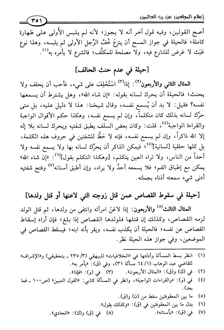 المثال الثالث (٨) والأربعون: إذا لاعَنَ امرأته وانتفى من ولدها، ثم قتل الولد لزمه القصاص، وكذلك إن قتلها فلولدها القصاص إذا بلغ، فإن أراد إسقاط القصاص عن نفسه؛ فالحيلة أن يكذب نفسه، ويقر بأنه ابنه؛ فيسقط القصاص في الموضعين، وفي جواز هذه الحيلة نظر.