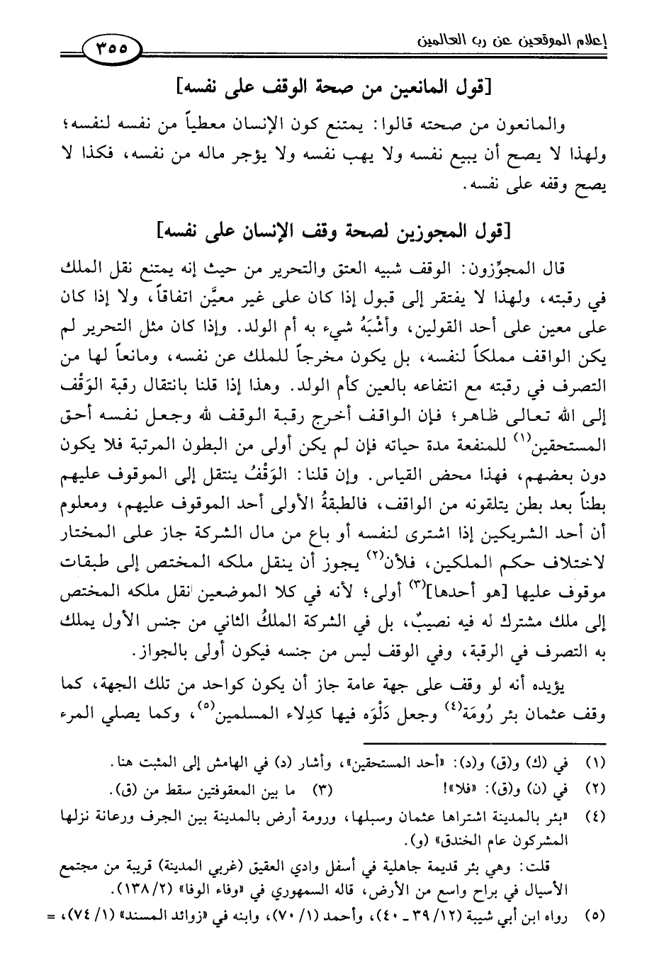قال المجوِّزون: الوقف شبيه العتق والتحرير من حيث إنه يمتنع نقل الملك في رقبته، ولهذا لا يفتقر إلى قبول إذا كان على غير معيَّن اتفاقًا، ولا إذا كان على معين على أحد القولين، وأشْبَهُ شيء به أم الولد. وإذا كان مثل التحرير لم يكن الواقف مملكًا لنفسه، بل يكون مخرجًا للملك عن نفسه، ومانعًا لها من التصرف في رقبته مع انتفاعه بالعين كام الولد. وهذا إذا قلنا بانتقال رقبة الوَقْف إلى اللَّه تعالى ظاهر؛ فإن الواقف أخرج رقبة الوقف للَّه وجعل نفسه أحق المستحقين (١) للمنفعة مدة حياته فإن لم يكن أولى من البطون المرتبة فلا يكون دون بعضهم، فهذا محض القياس. وإن قلنا: الوَقْفُ ينتقل إلى الموقوف عليهم بطنًا بعد بطن يتلقونه من الواقف، فالطبقةُ الأولى أحد الموقوف عليهم، ومعلوم أن أحد الشريكين إذا اشترى لنفسه أو باع من مال الشركة جاز على المختار لاختلاف حكم الملكين، فلأن (٢) يجوز أن ينقل ملكه المختص إلى طبقات موقوف عليها [هو أحدها] (٣) أولى؛ لأنه في كلا الموضعين نقل ملكه المختص إلى ملك مشترك اسه فيه نصيبٌ، بل في الشركة الملكُ الثاني من جنس الأول يملك به التصرف في الرقبة، وفي الوقف ليس من جنسه فيكون أولى بالجواز.