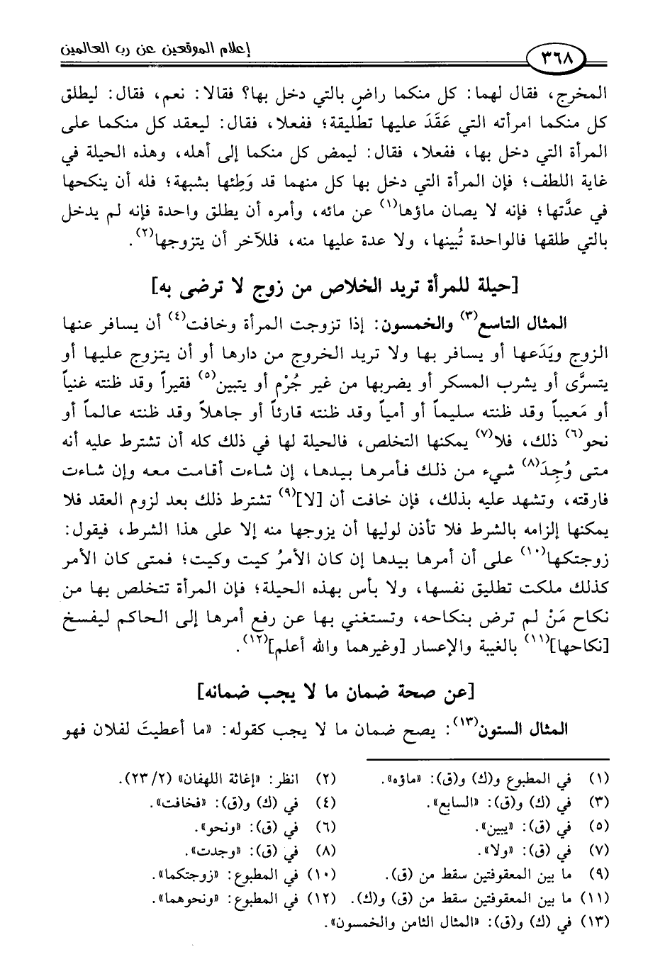 المثال التاسع (٣) والخمسون: إذا تزوجت المرأة وخافت (٤) أن يسافر عنها الزوج ويَدَعها أو يسافر بها ولا تريد الخروج من دارها أو أن يتزوج عليها أو يتسرَّى أو يشرب المسكر أو يضربها من غير جُرْم أو يتبين (٥) فقيرًا وقد ظنته غنيًا أو مَعيبًا وقد ظنته سليمًا أو أميًا وقد ظنته قارئًا أو جاهلًا وقد ظنته عالمًا أو نحو (٦) ذلك، فلا (٧) يمكنها التخلص، فالحيلة لها في ذلك كله أن تشترط عليه أنه متى وُجِدَ (٨) شيء من ذلك فأمرها بيدها، إن شاءت أقامت معه وإن شاءت فارقته، وتشهد عليه بذلك، فإن خافت أن [لا] (٩) تشترط ذلك بعد لزوم العقد فلا يمكنها إلزامه بالشرط فلا تأذن لوليها أن يزوجها منه إلا على هذا الشرط، فيقول: زوجتكها (١٠) على أن أمرها بيدها إن كان الأمرُ كيت وكيت؛ فمتى كان الأمر كذلك ملكت تطليق نفسها، ولا بأس بهذه الحيلة؛ فإن المرأة تتخلص بها من نكاح مَنْ لم ترض بنكاحه، وتستغني بها عن رفع أمرها إلى الحاكم ليفسخ [نكاحها] (١١) بالغيبة والإعسار [وغيرهما واللَّه أعلم] (١٢).