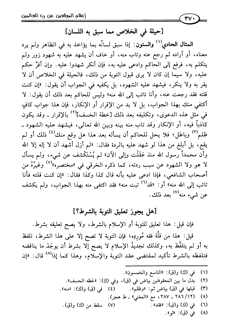 قيل: هذا من قلَّة فقه مُورِدِه؛ فإن التوبة لا تصح إلا على هذا الشرط، تلفظ به أو لم يتلفَّظ به، وكذلك تجديدُ الإسلام لا يصح إلا بشرط أن يوجَدَ ما يناقضه فتلفظه بالشرط تأكيد لمقتضى عقد التوبة والإسلام، وهذا كما إذا (٨) قال: "إن