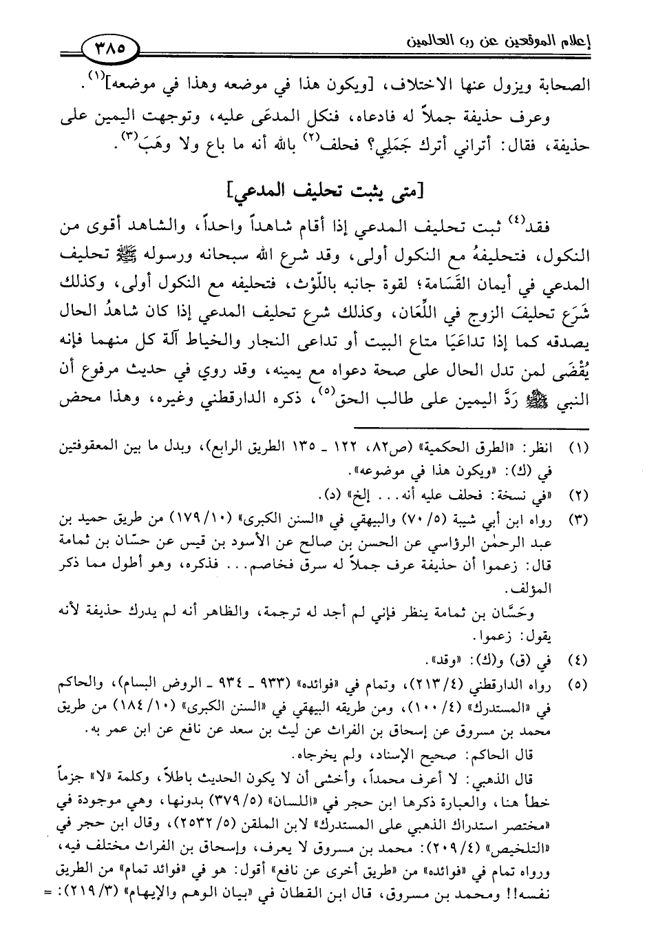 وعرف حذيفة جملًا له فادعاه، فنكل المدعَى عليه، وتوجهت اليمين على حذيفة، فقال: أتراني أترك جَمَلِي؟ فحلف (٢) باللَّه أنه ما باع ولا وهبَ (٣).