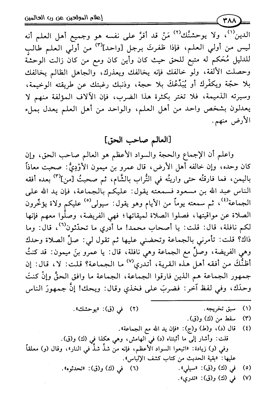 واعلم أن الإجماع والحجة والسواد الأعظم هو العالم صاحب الحق، وإن كان وحده، وإن خالفه أهل الأرض، قال عمرو بن ميمون الأوْدِيُّ: صحبت معاذًا باليمين، فما فارقتُه حتى واريتُه في التُّراب بالشَّام، ثم صحبتُ [من] (٣) بعده أفقه الناس عبد اللَّه بن مسعود فسمعته يقول: عليكم بالجماعة، فإن يد اللَّه على الجماعة (٤)، ثم سمعته يومًا من الأيام وهو يقول: سيولى (٥) عليكم ولاة يؤخِّرون الصلاة عن مواقيتها، فصلوا الصلاة لميقاتها؛ فهي الفريضة، وصلَّوا معهم فإنها لكم نافلة، قال: قلت: يا أصحاب محمد! ما أدري ما تحدّثون (٦)، قال: وما ذاك؟ قلت: تأمرني بالجماعة وتحضني عليها ثم تقول لي: صلِّ الصلاة وحدك وهي الفريضة، وصلِّ مع الجماعة وهي نافلة، قال: يا عمرو بنَ ميمون: قد كنتُ أظنُّكَ من أفقه أهل هذه القرية، أتدري (٧) ما الجماعة؟ قلت: لا، قال: إن جمهور الجماعة هم الذين فارقوا الجماعة، الجماعة ما وافق الحقَّ وإنْ كنتَ وحدَك، وفي لفظ آخر: فضربَ على فخذي وقال: ويحك! إنَّ جمهورَ الناس