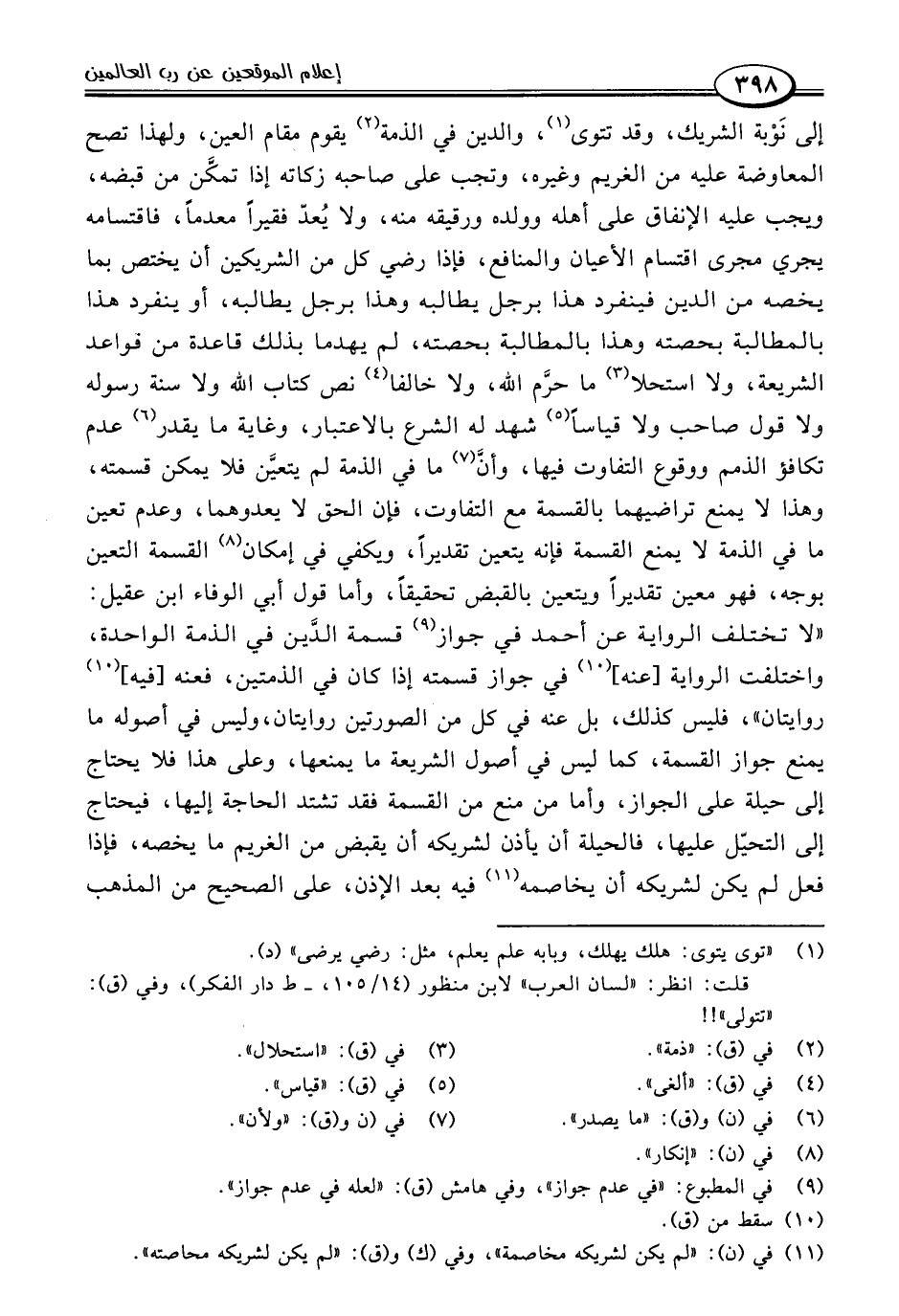 إلى نَوْبة الشريك، وقد تتوى (١)، والدين في الذمة (٢) يقوم مقام العين، ولهذا تصح المعاوضة عليه من الغريم وغيره، وتجب على صاحبه زكاته إذا تمكَّن من قبضه، ويجب عليه الإنفاق على أهله وولده ورقيقه منه، ولا يُعدّ فقيرًا معدمًا، فاقتسامه يجري مجرى اقتسام الأعيان والمنافع، فإذا رضي كل من الشريكين أن يختص بما يخصه من الدين فينفرد هذا برجل يطالبه وهذا برجل يطالبه، أو ينفرد هذا بالمطالبة بحصته وهذا بالمطالبة بحصته، لم يهدما بذلك قاعدة من قواعد الشريعة، ولا استحلا (٣) ما حرَّم اللَّه، ولا خالفا (٤) نص كتاب اللَّه ولا سنة رسوله ولا قول صاحب ولا قياسًا (٥) شهد له الشرع بالاعتبار، وغاية ما يقدر (٦) عدم تكافؤ الذمم ووقوع التفاوت فيها، وأنَّ (٧) ما في الذمة لم يتعيَّن فلا يمكن قسمته، وهذا لا يمنع تراضيهما بالقسمة مع التفاوت، فإن الحق لا يعدوهما، وعدم تعين ما في الذمة لا يمنع القسمة فإنه يتعين تقديرًا، ويكفي في إمكان (٨) القسمة التعين بوجه، فهو معين تقديرًا ويتعين بالقبض تحقيقًا، وأما قول أبي الوفاء ابن عقيل: "لا تختلف الرواية عن أحمد في جواز (٩) قسمة الدَّين في الذمة الواحدة، واختلفت الرواية [عنه] (١٠) في جواز قسمته إذا كان في الذمتين، فعنه [فيه] (١٠) روايتان"، فليس كذلك، بل عنه في كل من الصورتين روايتان، وليس في أصوله ما يمنع جواز القسمة، كما ليس في أصول الشريعة ما يمنعها، وعلى هذا فلا يحتاج إلى حيلة على الجواز، وأما من منع من القسمة فقد تشتد الحاجة إليها، فيحتاج إلى التحيّل عليها، فالحيلة أن يأذن لشريكه أن يقبض من الغريم ما يخصه، فإذا فعل لم يكن لشريكه أن يخاصمه (١١) فيه بعد الإذن، على الصحيح من المذهب