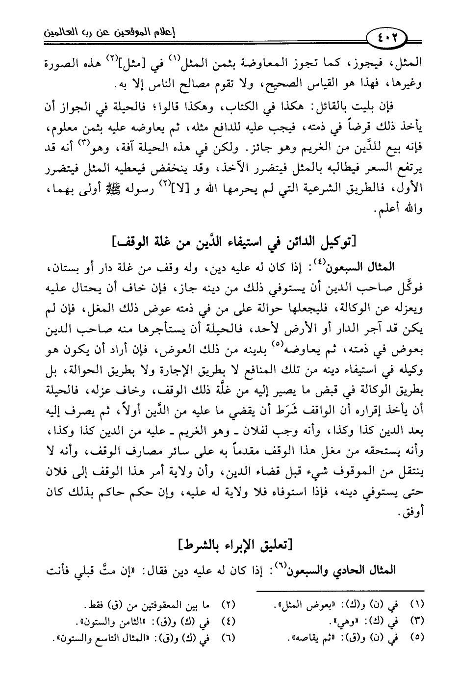 المثال السبعون (٤): إذا كان له عليه دين، وله وقف من غلة دار أو بستان، فوكَّل صاحب الدين أن يستوفي ذلك من دينه جاز، فإن خاف أن يحتال عليه ويعزله عن الوكالة، فليجعلها حوالة على من في ذمته عوض ذلك المغل، فإن لم يكن قد آجر الدار أو الأرض لأحد، فالحيلة أن يستأجرها منه صاحب الدين بعوض في ذمته، ثم يعاوضه (٥) بدينه من ذلك العوض، فإن أراد أن يكون هو وكيله في استيفاء دينه من تلك المنافع لا بطريق الإجارة ولا بطريق الحوالة، بل بطريق الوكالة في قبض ما يصير إليه من غلَّة ذلك الوقف، وخاف عزله، فالحيلة أن يأخذ إقراره أن الواقف شَرَط أن يقضي ما عليه من الدَّين أولًا، ثم يصرف إليه بعد الدين كذا وكذا، وأنه وجب لفلان -وهو الغريم- عليه من الدين كذا وكذا، وأنه يستحقه من مغل هذا الوقف مقدمًا به على سائر مصارف الوقف، وأنه لا ينتقل من الموقوف شيء قبل قضاء الدين، وأن ولاية أمر هذا الوقف إلى فلان حتى يستوفي دينه، فإذا استوفاه فلا ولاية له عليه، كان حكم حاكم بذلك كان أوفق.