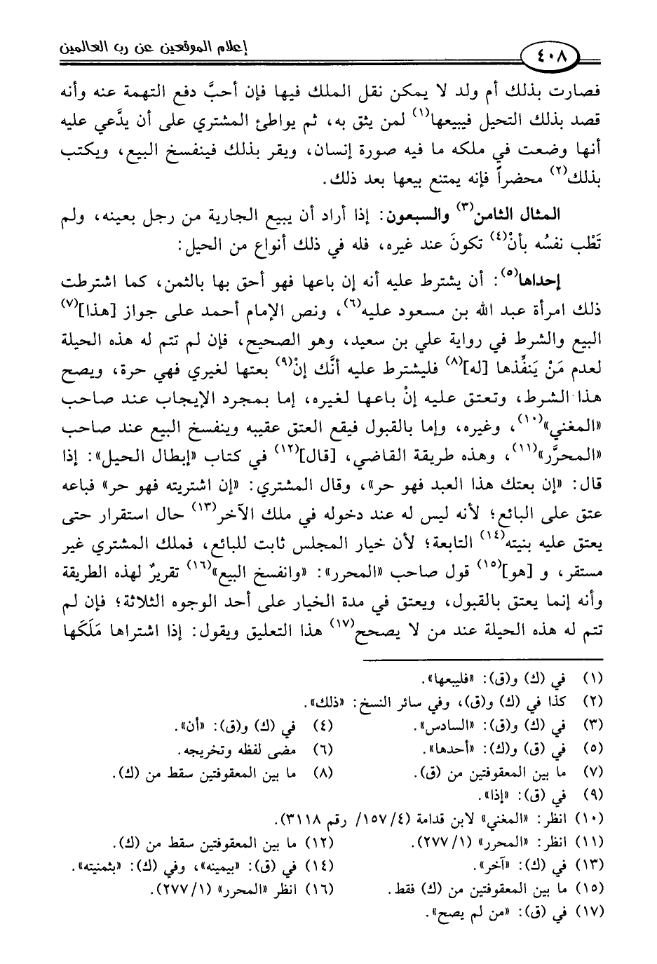 إحداها (٥): أن يشترط عليه أنه إن باعها فهو أحق بها بالثمن، كما اشترطت ذلك امرأة عبد اللَّه بن مسعود عليه (٦)، ونص الإمام أحمد على جواز [هذا] (٧) البيع والشرط في رواية علي بن سعيد، وهو الصحيح، فإن لم تتم له هذه الحيلة لعدم مَنْ يَنفِّذها [له] (٨) فليشترط عليه أنَّك إنْ (٩) بعتها لغيري فهي حرة، ويصح هذا الشرط، وتعتق عليه إنْ باعها لغيره، إما بمجرد الإيجاب عند صاحب "المغني" (١٠)، وغيره، وإما بالقبول فيقع العتق عقيبه وينفسخ البيع عند صاحب "المحرَّر" (١١)، وهذه طريقة القاضي، [قال] (١٢) في كتاب "إبطال الحيل": إذا قال: "إن بعتك هذا العبد فهو حر"، وقال المشتري: "إن اشتريته فهو حر" فباعه عتق على البائع؛ لأنه ليس له عند دخوله في ملك الآخر (١٣) حال استقرار حتى يعتق عليه بنيته (١٤) التابعة؛ لأن خيار المجلس ثابت للبائع، فملك المشتري غير مستقر، و [هو] (١٥) قول صاحب "المحرر": "وانفسخ البيع " (١٦) تقريرٌ لهذه الطريقة وأنه إنما يعتق بالقبول، ويعتق في مدة الخيار على أحد الوجوه الثلاثة؛ فإن لم تتم له هذه الحيلة عند من لا يصحح (١٧) هذا التعليق ويقول: إذا اشتراها مَلَكَها