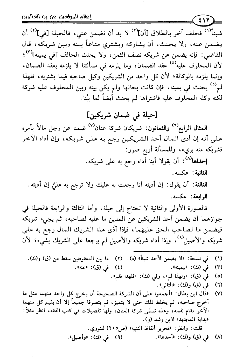 المثال الرابع (٦) والثمانون: شريكان شركة عنان (٧) ضمنا عن رجل مالًا بأمره على أنه إن أدى المال أحد الشريكين رجع به على شريكه، وإن أداه الآخر فشريكه منه بريء، وللمسألة أربع صور: