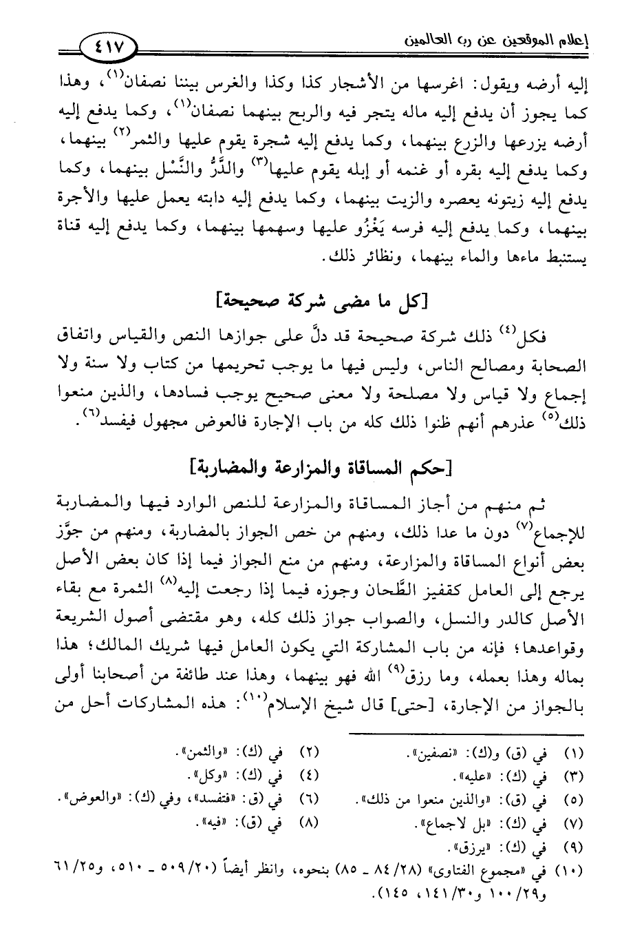 ثم منهم من أجاز المساقاة والمزارعة للنص الوارد فيها والمضاربة للإجماع (٧) دون ما عدا ذلك، ومنهم من خص الجواز بالمضاربة، ومنهم من جوَّز بعض أنواع المساقاة والمزارعة، ومنهم من منع الجواز فيما إذا كان بعض الأصل يرجع إلى العامل كقفيز الطَّحان وجوزه فيما إذا رجعت إليه (٨) الثمرة مع بقاء الأصل كالدر والنسل، والصواب جواز ذلك كله، وهو مقتضى أصول الشريعة وقواعدها؛ فإنه من باب المشاركة التي يكون العامل فيها شريك المالك؛ هذا بماله وهذا بعمله، وما رزق (٩) اللَّه فهو بينهما، وهذا عند طائفة من أصحابنا أولى بالجواز من الإجارة، [حتى] قال شيخ الإسلام (١٠): هذه المشاركات أحل من