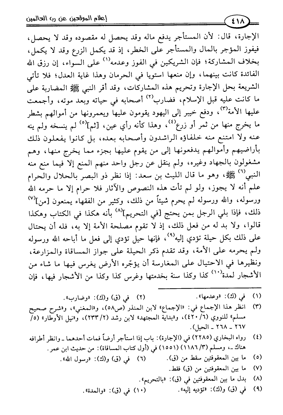 الإجارة، قال: لأن المستأجر يدفع ماله وقد يحصل له مقصوده وقد لا يحصل، فيفوز المؤجر بالمال والمستأجر على الخطر، إذ قد يكمل الزرع وقد لا يكمل، بخلاف المشاركة؛ فإن الشريكين في الفوز وعدمه (١) على السواء، إن رزق اللَّه الفائدة كانت بينهما، وإن منعها استويا في الحرمان وهذا غاية العدل؛ فلا تأتي الشريعة بحل الإجارة وتحريم هذه المشاركات، وقد أقر النبي -صلى اللَّه عليه وسلم- المضاربة على ما كانت عليه قبل الإسلام، فضارب (٢) أصحابه في حياته وبعد موته، وأجمعت عليها الأمة (٣)، ودفع خيبر إلى اليهود يقومون عليها ويعمرونها من أموالهم بشطر ما يخرج منها من ثمر أو زرع (٤)، وهذا كأنه رأي عين، [ثم] (٥) لم ينسخه ولم ينه عنه ولا امتنع منه خلفاؤه الراشدون وأصحابه بعده، بل كانوا يفعلون ذلك بأراضيهم وأموالهم يدفعونها إلى من يقوم عليها بجزء مما يخرج منها، وهم مشغولون بالجهاد وغيره، ولم ينقل عن رجل واحد منهم المنع إلا فيما منع منه النبي (٦) -صلى اللَّه عليه وسلم-، وهو ما قال الليث بن سعد: إذا نظر ذو البصر بالحلال والحرام علم أنه لا يجوز، ولو لم تأت هذه النصوص والآثار فلا حرام إلا ما حرمه اللَّه ورسوله، واللَّه ورسوله لم يحرم شيئًا من ذلك، وكثير من الفقهاء يمنعون [من] (٧) ذلك، فإذا بلي الرجل بمن يحتج [في التحريم] (٨) بأنه هكذا في الكتاب وهكذا قالوا، ولا بد له من فعل ذلك، إذ لا تقوم مصلحة الأمة إلا به، فله أن يحتال على ذلك بكل حيلة تؤدي إليه (٩)، فإنها حيل تؤدي إلى فعل ما أباحه اللَّه ورسوله ولم يحرمه على الأمة، وقد تقدم ذكر الحيلة على جواز المساقاة والمزارعة، ونظيرها في الاحتيال على المغارسة أن يؤجّره الأرض يغرس فيها ما شاء من الأشجار لمدة (١٠) كذا وكذا سنة بخدمتها وغرس كذا وكذا من الأشجار فيها، فإن