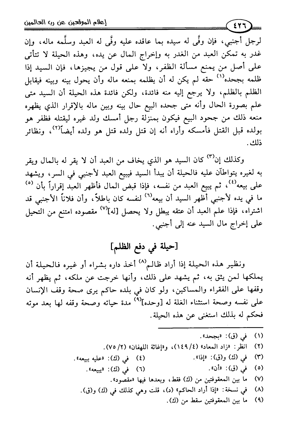 لرجل أجنبي، فإن وفَّى له سيده بما عاقده عليه وفَّى له العبد وسلَّمه ماله، وإن غدر به تمكن العبد من الغدر به وإخراج المال عن يده، وهذه الحيلة لا تتأتى على أصل من يمنع مسألة الظفر، ولا على قول من يجيزها، فإن السيد إذا ظلمه بجحده (١) حقه لم يكن له أن يظلمه بمنعه ماله وأن يحول بينه وبينه فيقابل الظلم بالظلم، ولا يرجع إليه منه فائدة، ولكن فائدة هذه الحيلة أن السيد متى علم بصورة الحال وأنه متى جحده البيع حال بينه وبين ماله بالإقرار الذي يظهره منعه ذلك من جحود البيع فيكون بمنزلة رجل أمسك ولد غيره ليقتله فظفر هو بولده قبل القتل فأمسكه وأراه أنه إن قتل ولده قتل هو ولده أيضًا (٢)، ونظائر ذلك.