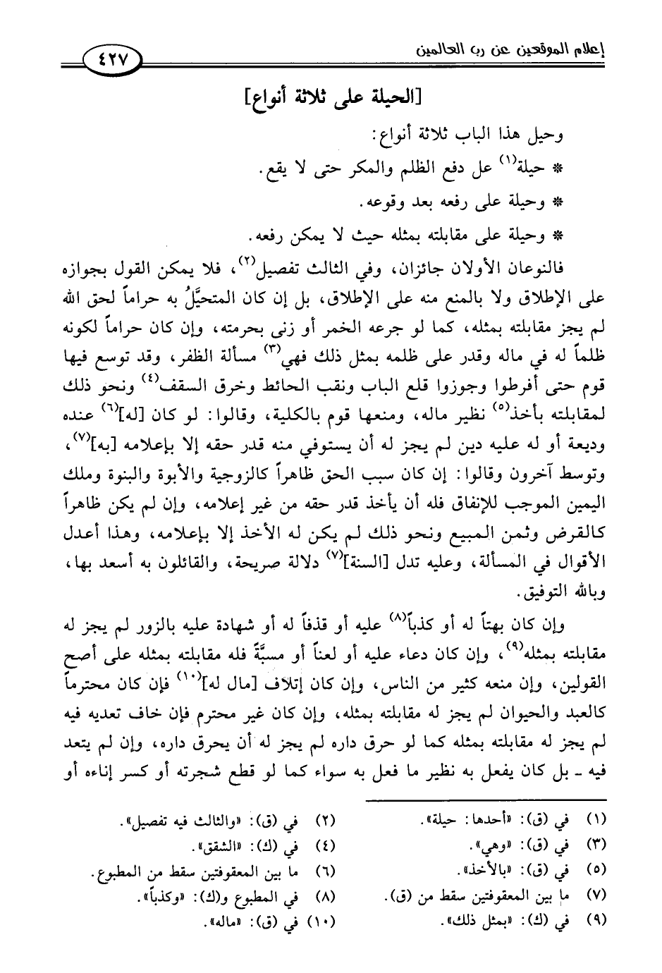 فالنوعان الأولان جائزان، وفي الثالث تفصيل (٢)، فلا يمكن القول بجوازه على الإطلاف ولا بالمنع منه على الإطلاق، بل إن كان المتحيَّلُ به حرامًا لحق اللَّه لم يجز مقابلته بمئله، كما لو جرعه الخمر أو زنى بحرمته، وإن كان حرامًا لكونه ظلمًا له في ماله وقدر على ظلمه بمثل ذلك فهي (٣) مسألة الظفر، وقد توسع فيها قوم حتى أفرطوا وجوزوا قلع الباب ونقب الحائط وخرق السقف (٤) ونحو ذلك لمقابلته بأخذ (٥) نظير ماله، ومنعها قوم بالكلية، وقالوا: لو كان [له] (٦) عنده وديعة أو له عليه دين لم يجز له أن يستوفي منه قدر حقه إلا بإعلامه [به] (٧)، وتوسط آخرون وقالوا: إن كان سبب الحق ظاهرًا كالزوجية والأبوة والبنوة وملك اليمين الموجب للإنفاف فله أن يأخذ قدر حقه من غير إعلامه، وإن لم يكن ظاهرًا كالقرض وثمن المبيع ونحو ذلك لم يكن له الأخذ إلا بإعلامه، وهذا أعدل الأقوال في المسألة، وعليه تدل [السنة] (٧) دلالة صريحة، والقائلون به أسعد بها، وباللَّه التوفيق.