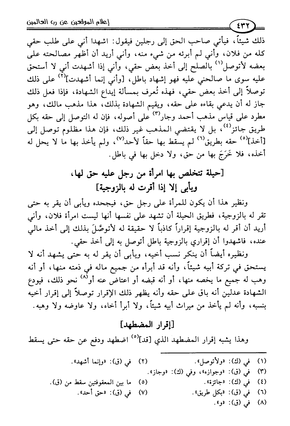 ونظير هذا أن يكون للمرأة على رجل حق، فيجحده ويأبى أن يقر به حتى تقر له بالزوجية، فطريق الحيلة أن تشهد على نفسها أنها ليست امرأة فلان، وأني أريد أن أقر له بالزوجية إقرارًا كاذبًا لا حقيقة له لأتوصَّلَ بذلك إلى أخذ مالي عنده، فاشهدوا أن إقراري بالزوجية باطل أتوصل به إلى أخذ حقي.