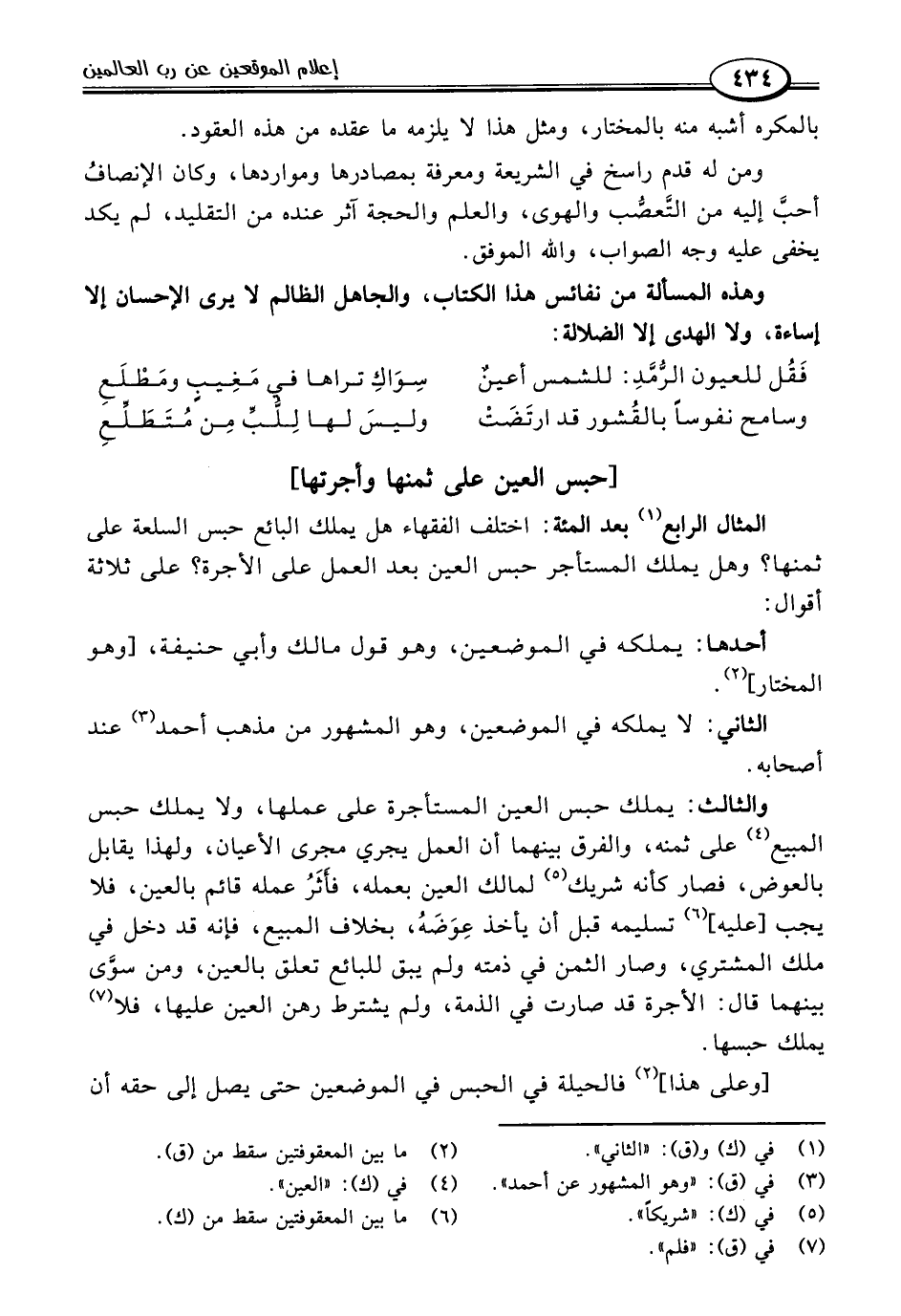 المثال الرابع (١) بعد المئة: اختلف الفقهاء هل يملك البائع حبس السلعة على ثمنها؟ وهل يملك المستأجر حبس العين بعد العمل على الأجرة؟ على ثلاثة أقوال: