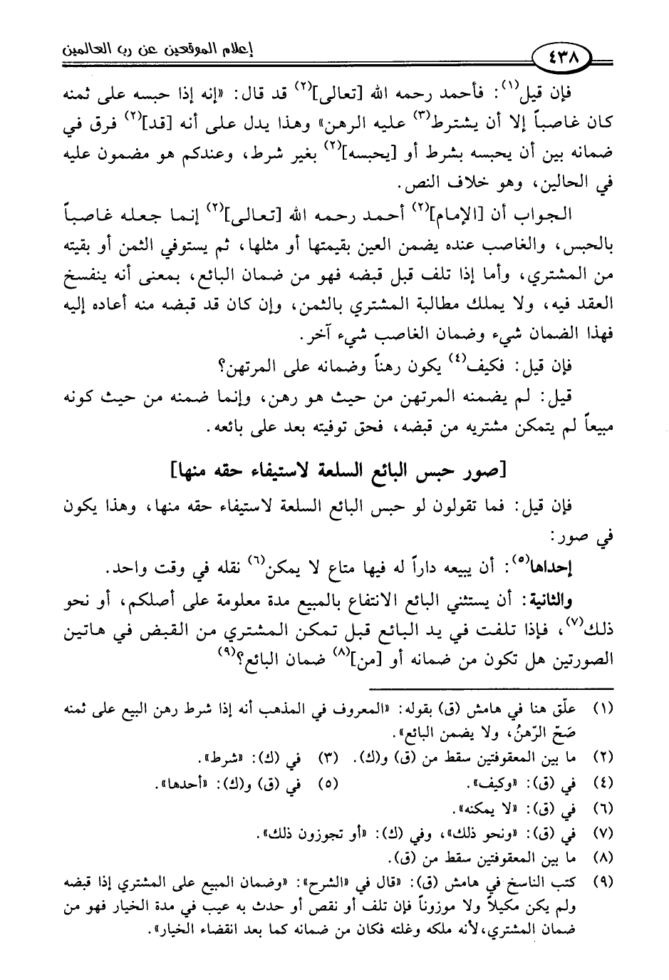 الجواب أن [الإمام] (٢) أحمد رحمه اللَّه [تعالى] (٢) إنما جعله غاصبًا بالحبس، والغاصب عنده يضمن العين بقيمتها أو مثلها، ثم يستوفي الثمن أو بقيته من المشتري، وأما إذا تلف قبل قبضه فهو من ضمان البائع، بمعنى أنه ينفسخ العقد فيه، ولا يملك مطالبة المشتري بالثمن، وإن كان قد قبضه منه أعاده إليه فهذا الضمان شيء وضمان الغاصب شيء آخر.