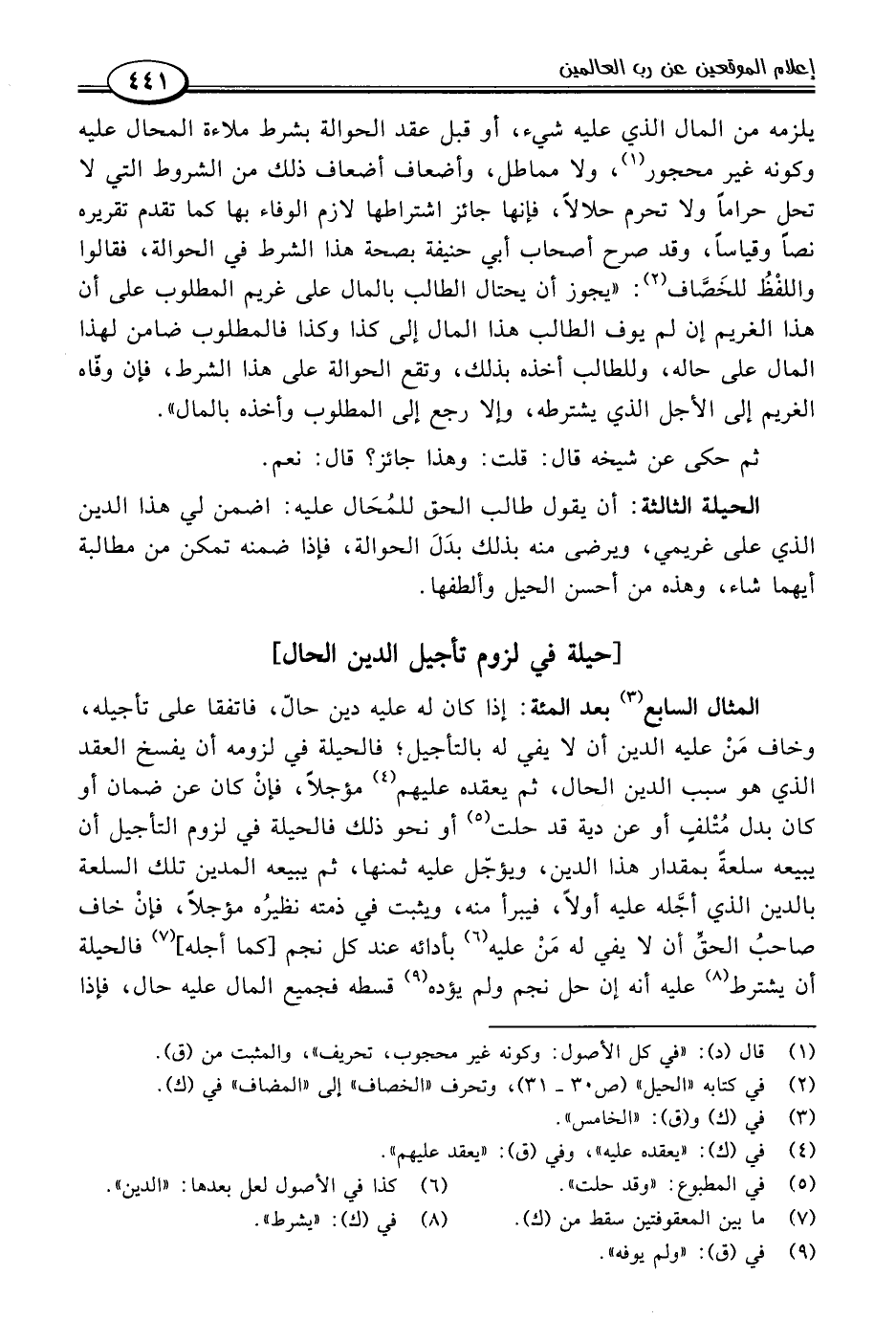 المثال السابع (٣) بعد المئة: إذا كان له عليه دين حالّ، فاتفقا على تأجيله، وخاف مَنْ عليه الدين أن لا يفي له بالتأجيل؛ فالحيلة في لزومه أن يفسخ العقد الذي هو سبب الدين الحال، ثم يعقده عليهم (٤) مؤجلًا، فإنْ كان عن ضمان أو كان بدل مُتْلفٍ أو عن دية قد حلت (٥) أو نحو ذلك فالحيلة في لزوم التأجيل أن يبيعه سلعة بمقدار هذا الدين، ويؤجّل عليه ثمنها، ثم يبيعه المدين تلك السلعة بالدين الذي أجَّله عليه أولًا، فيبرأ منه، ويثبت في ذمته نظيرُه مؤجلًا، فإنْ خاف صاحبُ الحقِّ أن لا يفي له مَنْ عليه (٦) بأدائه عند كل نجم [كما أجله] (٧) فالحيلة أن يشترط (٨) عليه أنه إن حل نجم ولم يؤده (٩) قسطه فجميع المال عليه حال، فإذا