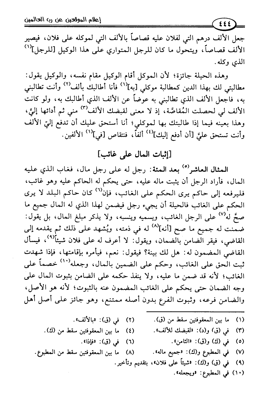 المثال العاشر (٥) بعد المئة: رجل له على رجل مال، فغاب الذي عليه المال، فأراد الرجل أن يثبت ماله عليه، حتى يحكم له الحاكم عليه وهو غائب، فليرفعه إلى حاكم يرى الحكم على الغائب، فإن (٦) كان حاكم البلد لا يرى الحكم على الغائب فالحيلة أن يجيء رجل فيضمن لهذا الذي له المال جميع ما صحَّ له (٧) على الرجل الغائب، ويسميه وينسبه، ولا يذكر مبلغ المال، بل يقول: ضمنت له جميع ما صح [أنه] (٨) له في ذمته، ويُشهد على ذلك ثم يقدمه إلى القاضي، فيقر الضامن بالضمان، ويقول: لا أعرف له على فلان شيئًا (٩)، فيسأل القاضي المضمون له: هل لك بينة؟ فيقول: نعم، فيأمره بإقامتها، فإذا شهدت ثبت الحق على الغائب، وحكم على الضمين بالمال، وجعله (١٠) خصمًا على الغائب؛ لأنه قد ضمن ما عليه، ولا ينفذ حكمه على الضامن بثبوت المال على وجه الضمان حتى يحكم على الغائب المضمون عنه بالثبوت؛ لأنه هو الأصل، والضامن فرعه، وثبوت الفرع بدون أصله ممتنع، وهو جائز على أصل أهل