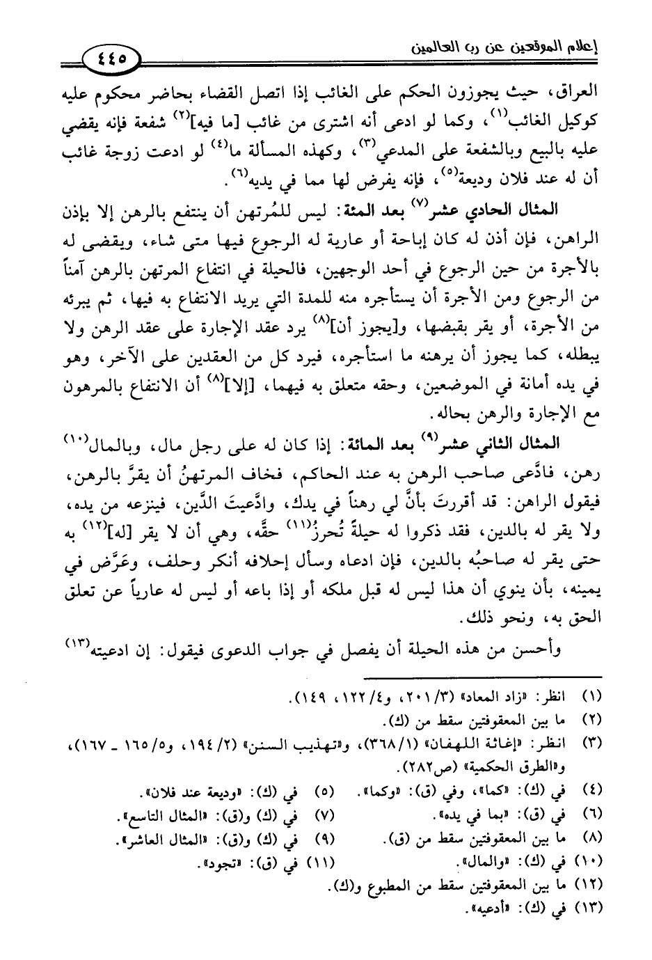 المثال الثاني عشر (٩) بعد المائة: إذا كان له على رجل مال، وبالمال (١٠) رهن، فادَّعى صاحب الرهن به عند الحاكم، فخاف المرتهنُ أن يقرَّ بالرهن، فيقول الراهن: قد أقررتَ بأنَّ لي رهنًا في يدك، واذَّعيتَ الدَّين، فينزعه من يده، ولا يقر له بالدين، فقد ذكروا له حيلةَ تُحرزُ (١١) حقَّه، وهي أن لا يقر [له] (١٢) به حتى يقر له صاحبُه بالدين، فإن ادعاه وسأل إحلافه أنكر وحلف، وعَرَّض في يمينه، بأن ينوي أن هذا ليس له قبل ملكه أو إذا باعه أو ليس له عاريًا عن تعلق الحق به، ونحو ذلك.