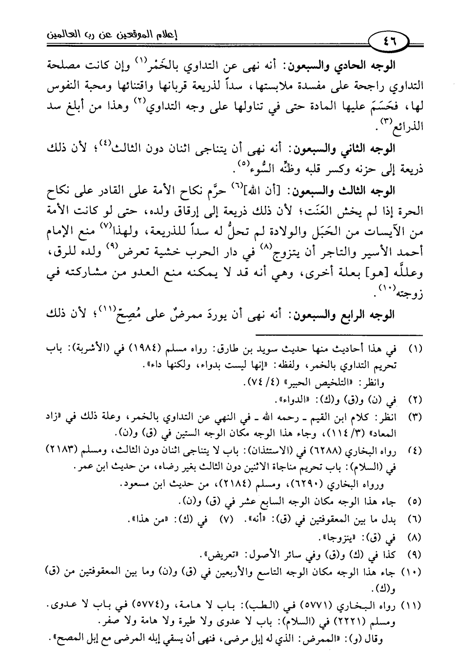 (٣) انظر: كلام ابن القيم -رحمه اللَّه- في النهي عن التداوي بالخمر، وعلة ذلك في "زاد المعاد" (٣/ ١١٤)، وجاء هذا الوجه مكان الوجه الستين في (ق) و (ن).