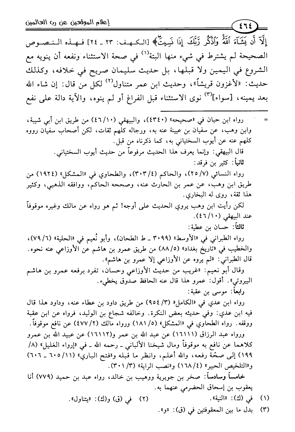 إلا أَنْ يَشَاءَ اللَّهُ وَاذْكُرْ رَبَّكَ إِذَا نَسِيتَ} [الكهف: ٢٤] فهذه النصوص الصحيحة لم يشترط في شيء منها البتة (١) في صحة الاستثناء ونفعه أن ينويه مع الشروع في اليمين ولا قبلها، بل حديث سليمان صريح في خلافه، وكذلك حديث: "لأغزون قريشًا"، وحديث ابن عمر متناول (٢) لكل من قال: إن شاء اللَّه بعد يمينه، [سواء] (٣) نوى الاستثناء قبل الفراغ أو لم ينوه، والآية دالة على نفع