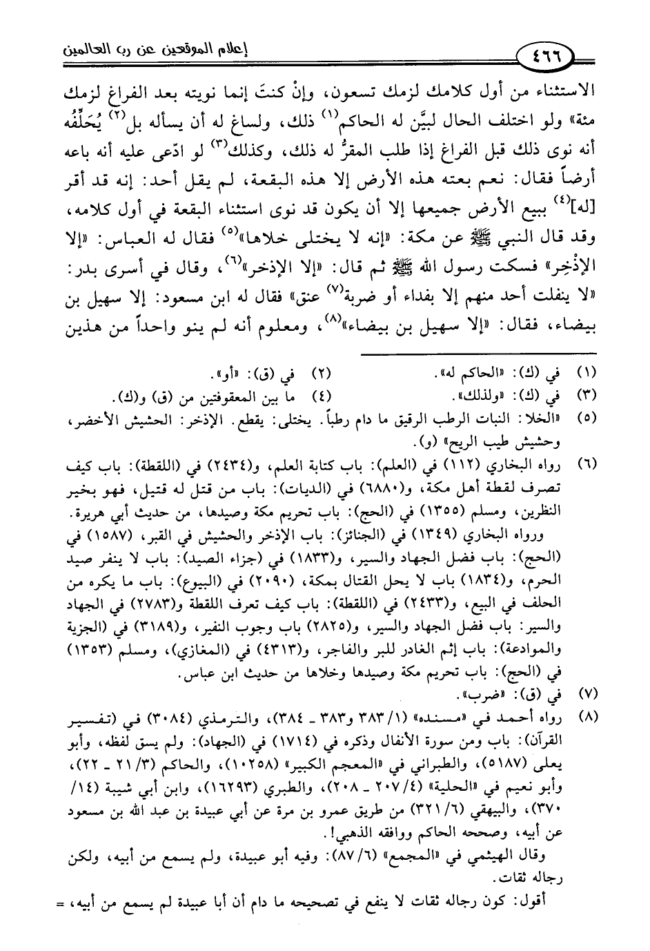 الاستثناء من أول كلامك لزمك تسعون، وإنْ كنتَ إنما نويته بعد الفراغ لزمك مئة" ولو اختلف الحال لبيَّن له الحاكم (١) ذلك، ولساغ له أن يسأله بل (٢) يُحَلِّفُه أنه نوى ذلك قبل الفراغ إذا طلب المقرُّ له ذلك، وكذلك (٣) لو ادّعى عليه أنه باعه أرضًا فقال: نعم بعته هذه الأرض إلا هذه البقعة، لم يقل أحد: إنه قد أقر [له] (٤) ببيع الأرض جميعها إلا أن يكون قد نوى استثناء البقعة في أول كلامه، وقد قال النبي -صلى اللَّه عليه وسلم- عن مكة: "إنه لا يختلى خلاها" (٥) فقال له العباس: "إلا الإذْخِر" فسكت رسول اللَّه -صلى اللَّه عليه وسلم- ثم قال: "إلا الإذخر" (٦)، وقال في أسرى بدر: "لا ينفلت أحد منهم إلا بفداء أو ضربة (٧) عنق" فقال له ابن مسعود: إلا سهيل بن بيضاء، فقال: "إلا سهيل بن بيضاء" (٨)، ومعلوم أنه لم ينو واحدًا من هذين